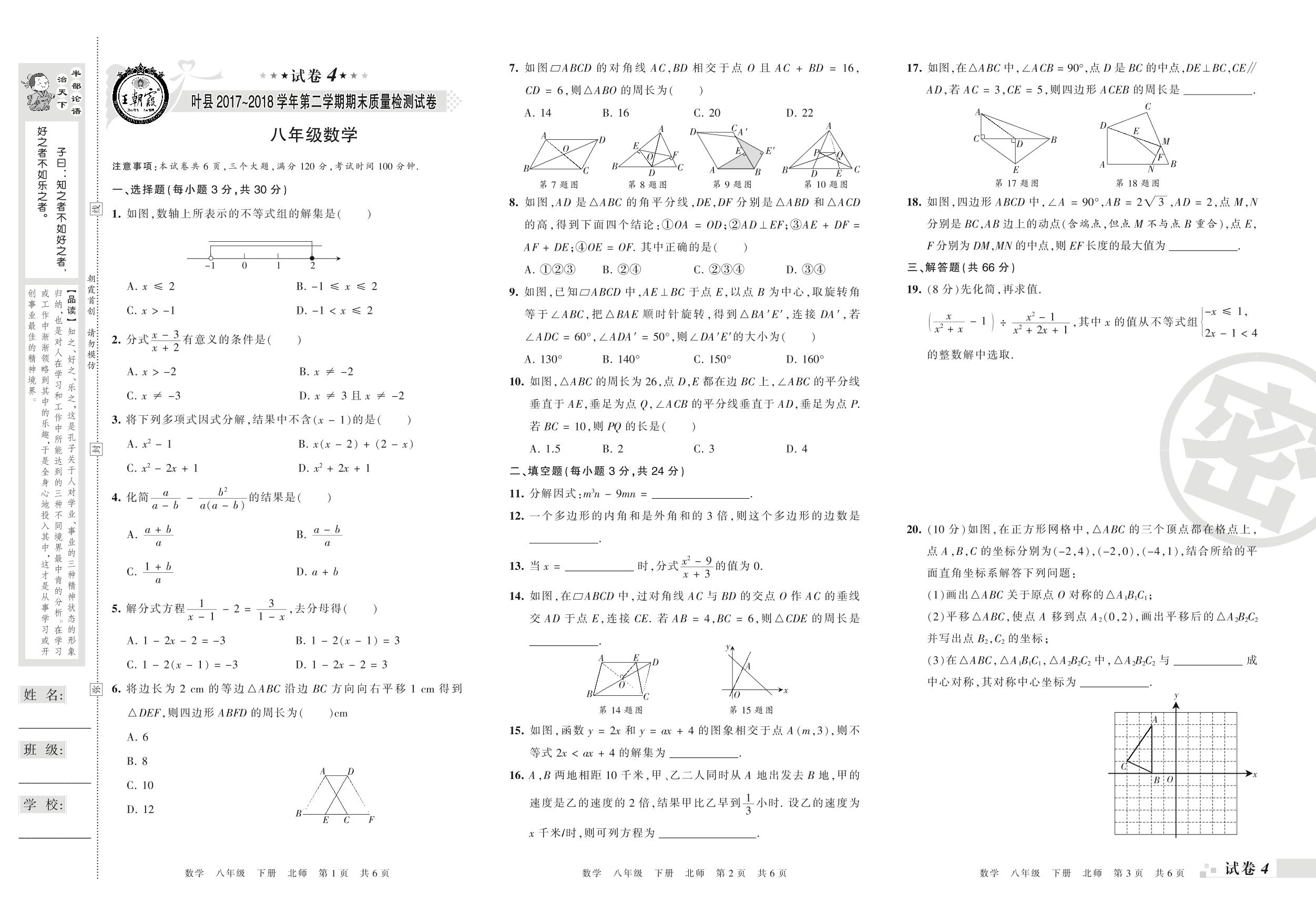 2017-2018学年第二学期平顶山市叶县八年级数学试卷(北师版)【4】