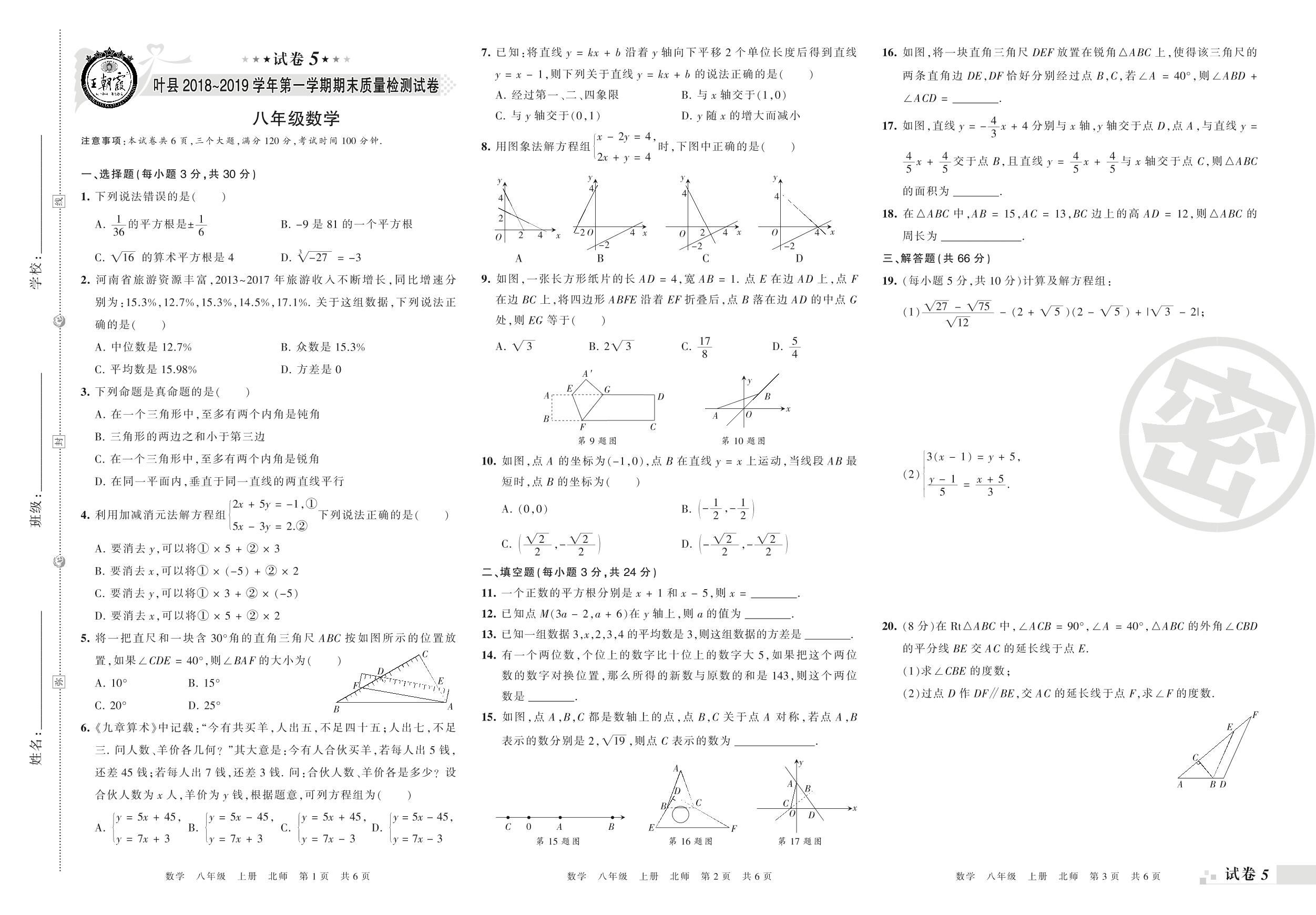 2018-2019学年第一学期平顶山市叶县八年级数学试卷(北师版)【5】