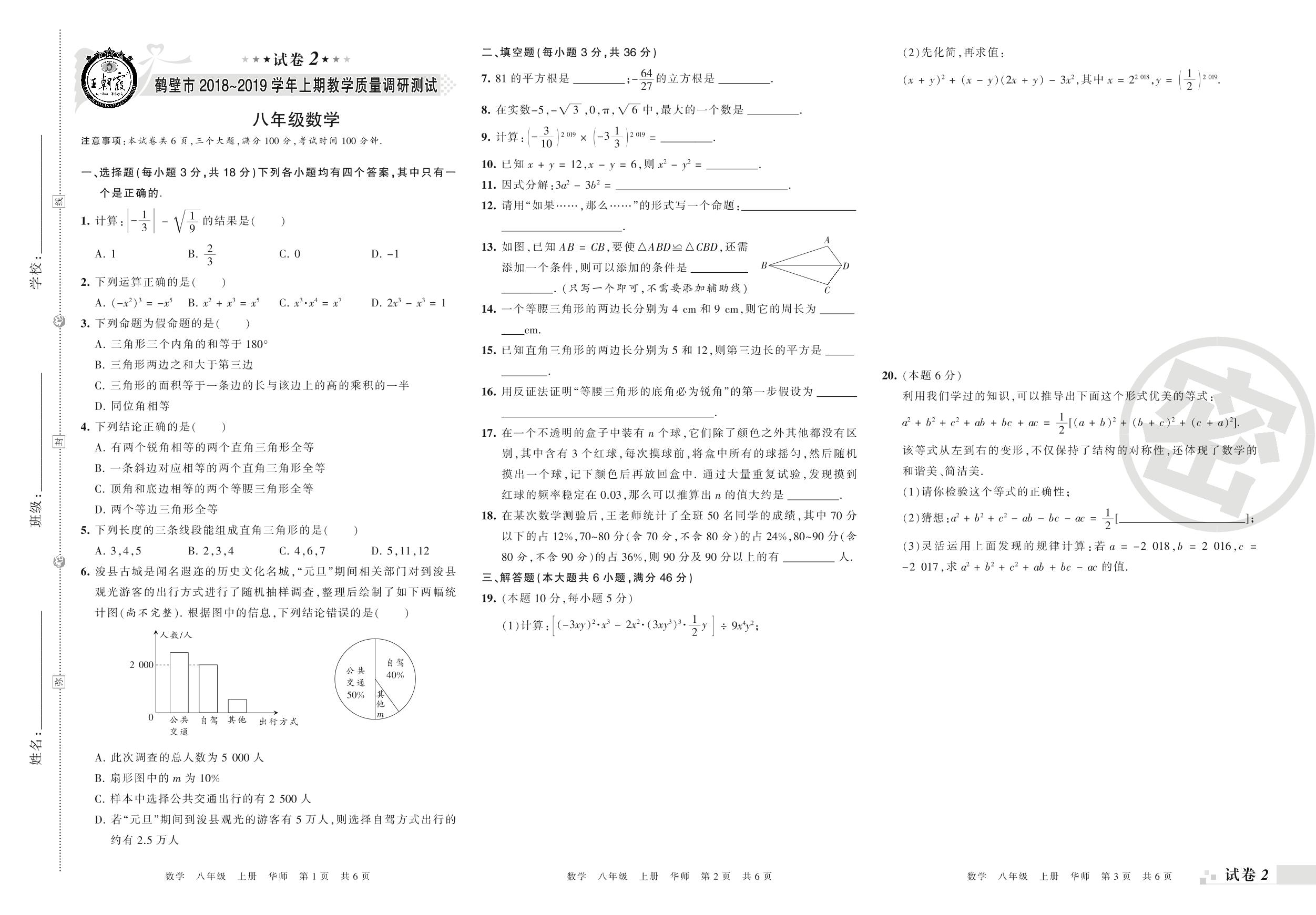 2018-2019学年第一学期鹤壁市八年级数学试卷(华师版)【2】