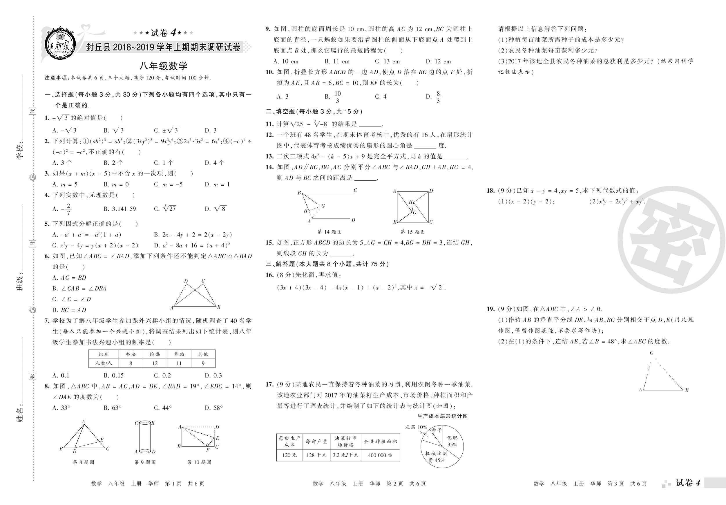 2018-2019学年第一学期新乡市封丘县八年级数学试卷(华师版)【4】