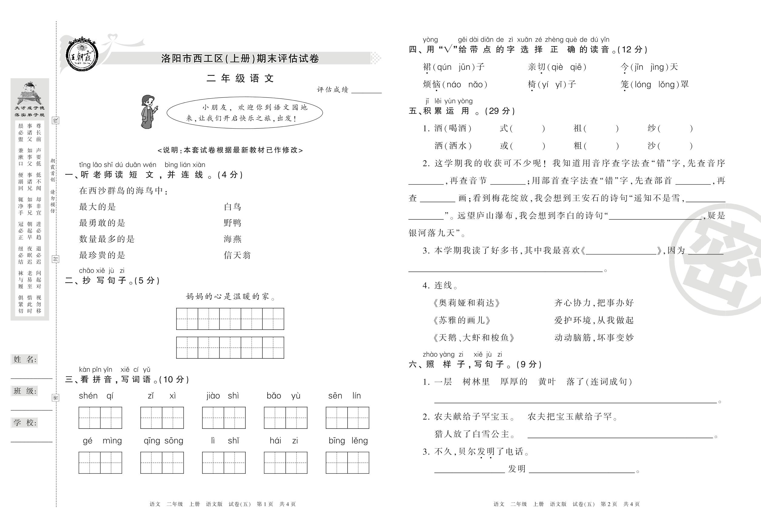 2016-2017学年第一学期洛阳市西工区二年级语文试卷(语文版)【5】