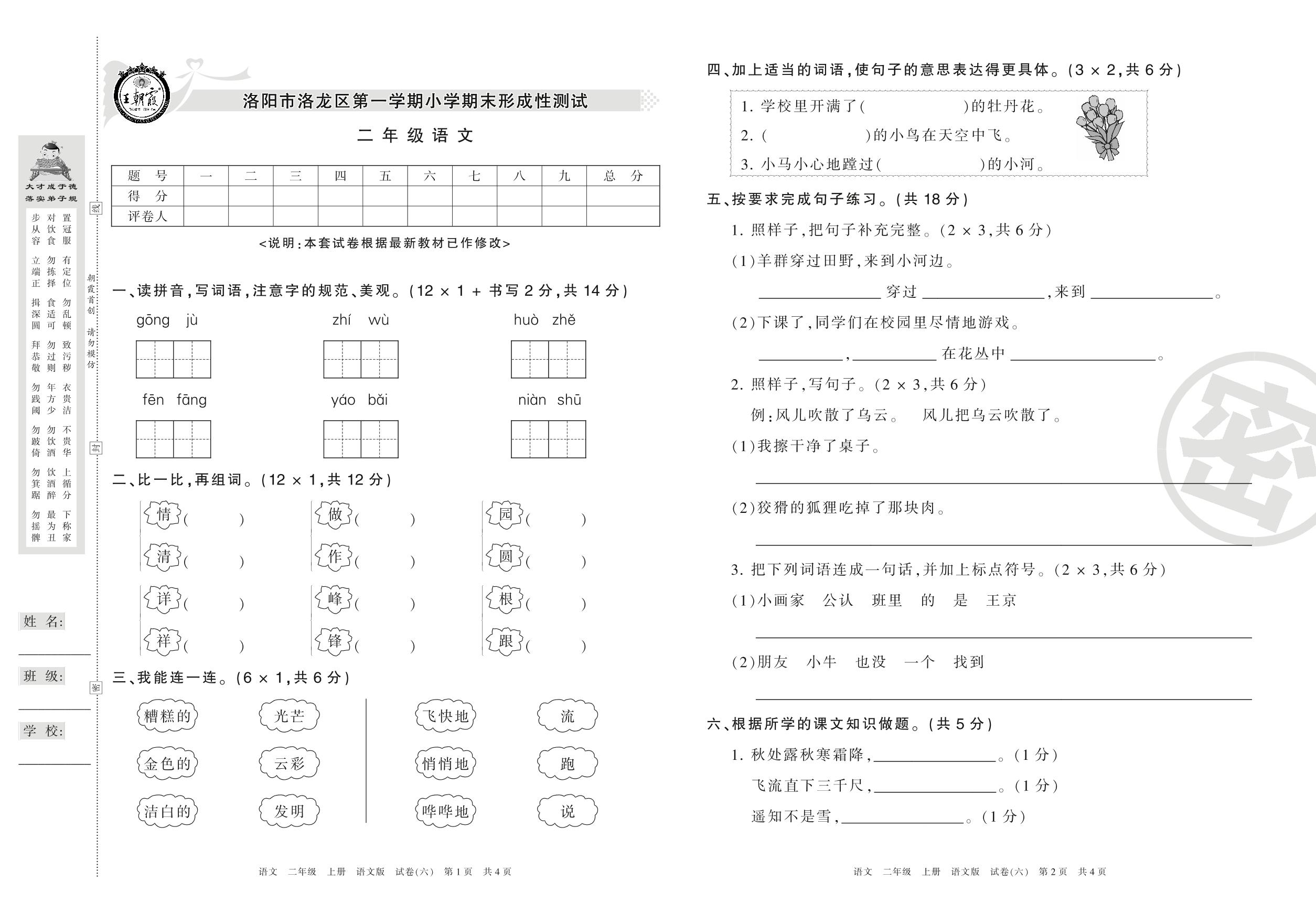 2016-2017学年第一学期洛阳市洛龙区二年级语文试卷(语文版)【6】