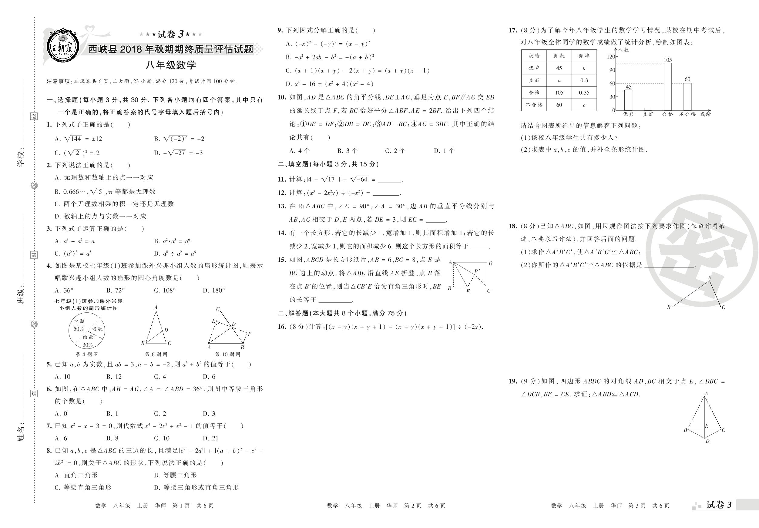 2018-2019学年第一学期南阳市西峡县八年级数学试卷(华师版)【3】
