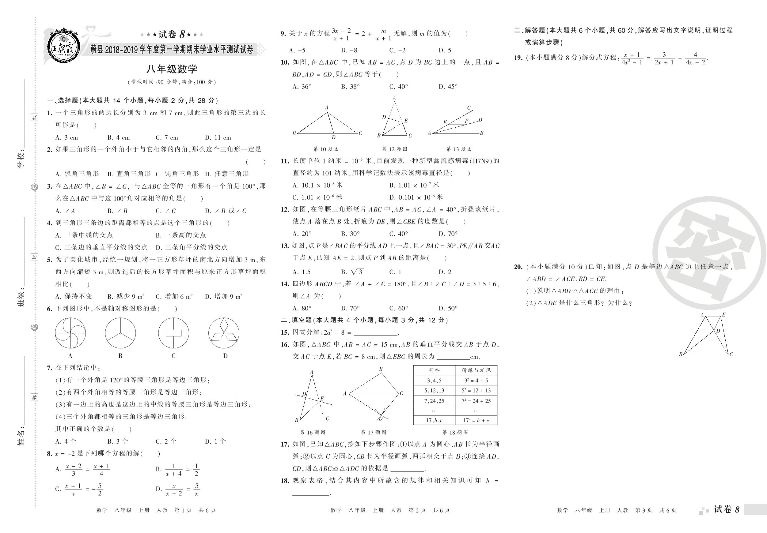 2018-2019学年第一学期张家口市蔚县八年级数学试卷(人教版)【8】