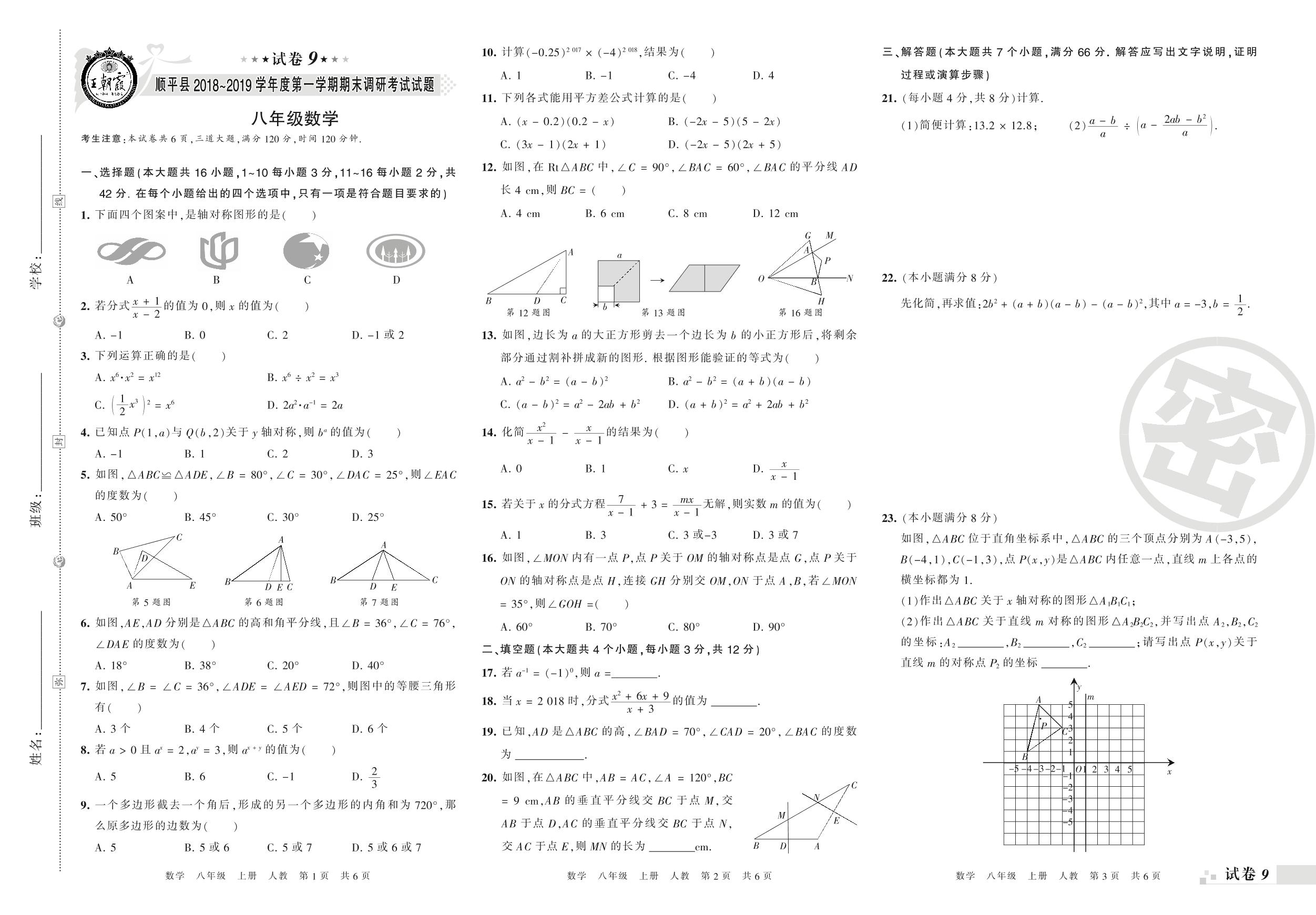2018-2019学年第一学期保定市顺平县八年级数学试卷(人教版)【9】
