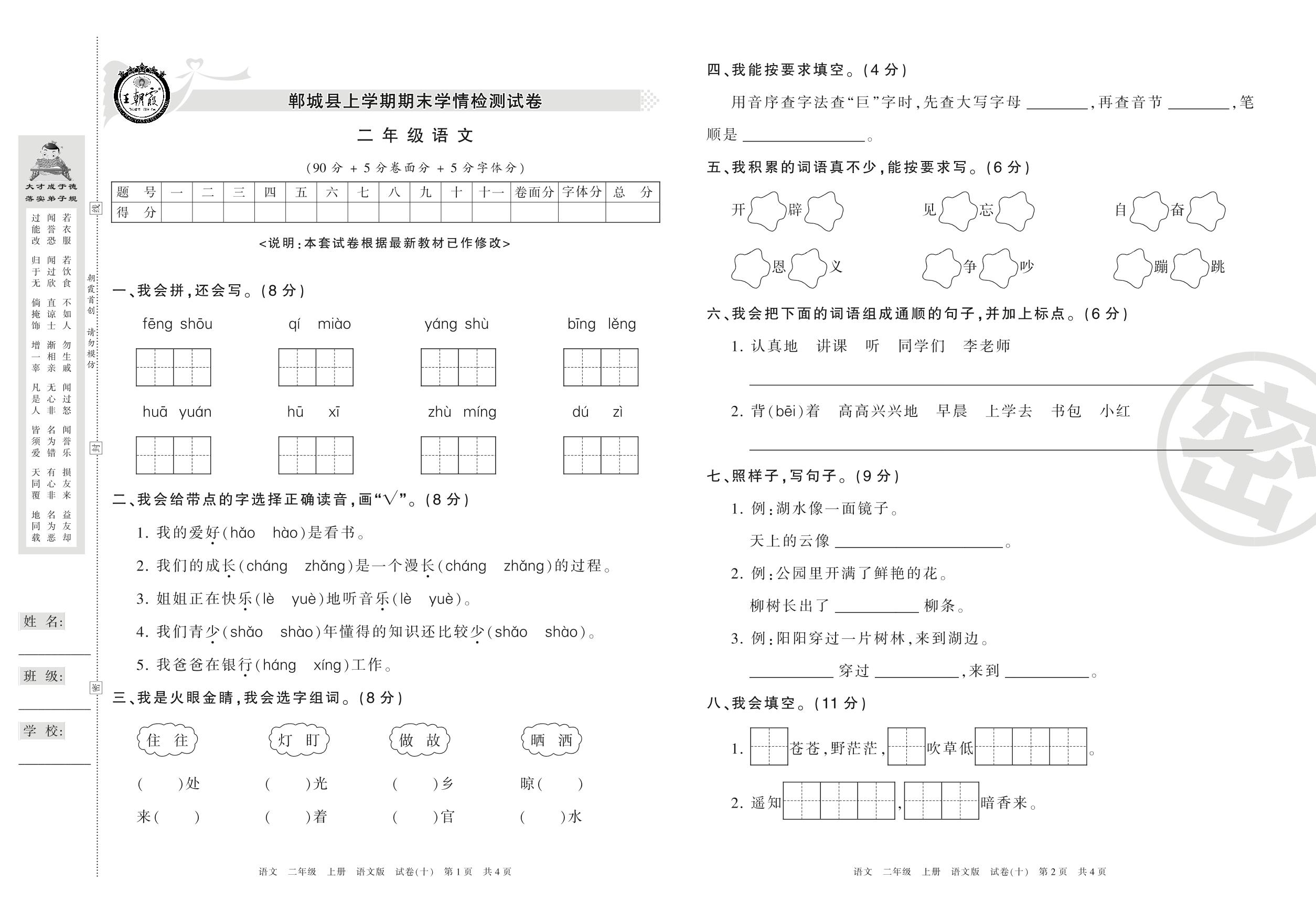 2016-2017学年第一学期周口市郸城县二年级语文试卷(语文版)【10】
