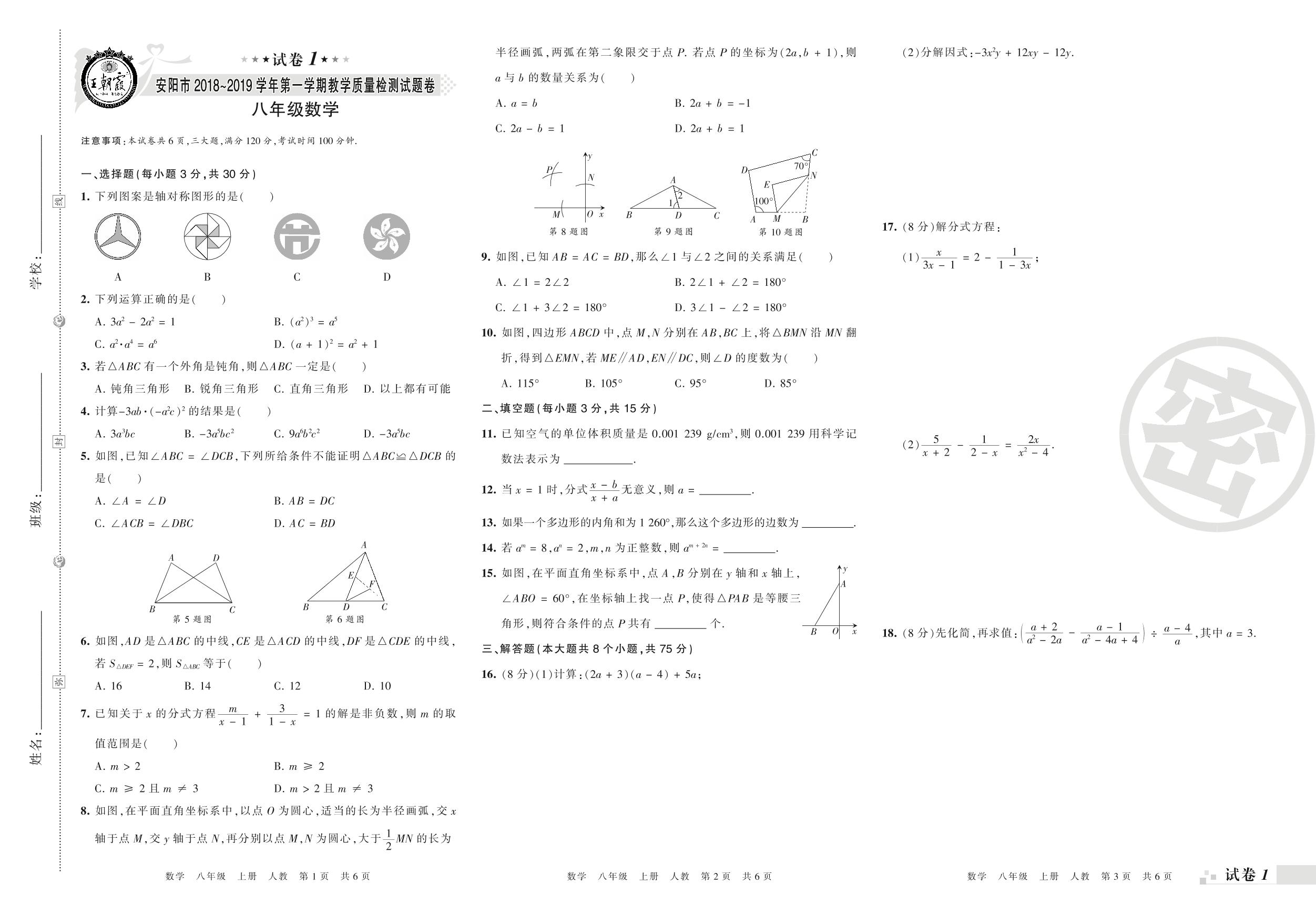 2018-2019学年第一学期安阳市八年级数学试卷(人教版)【1】