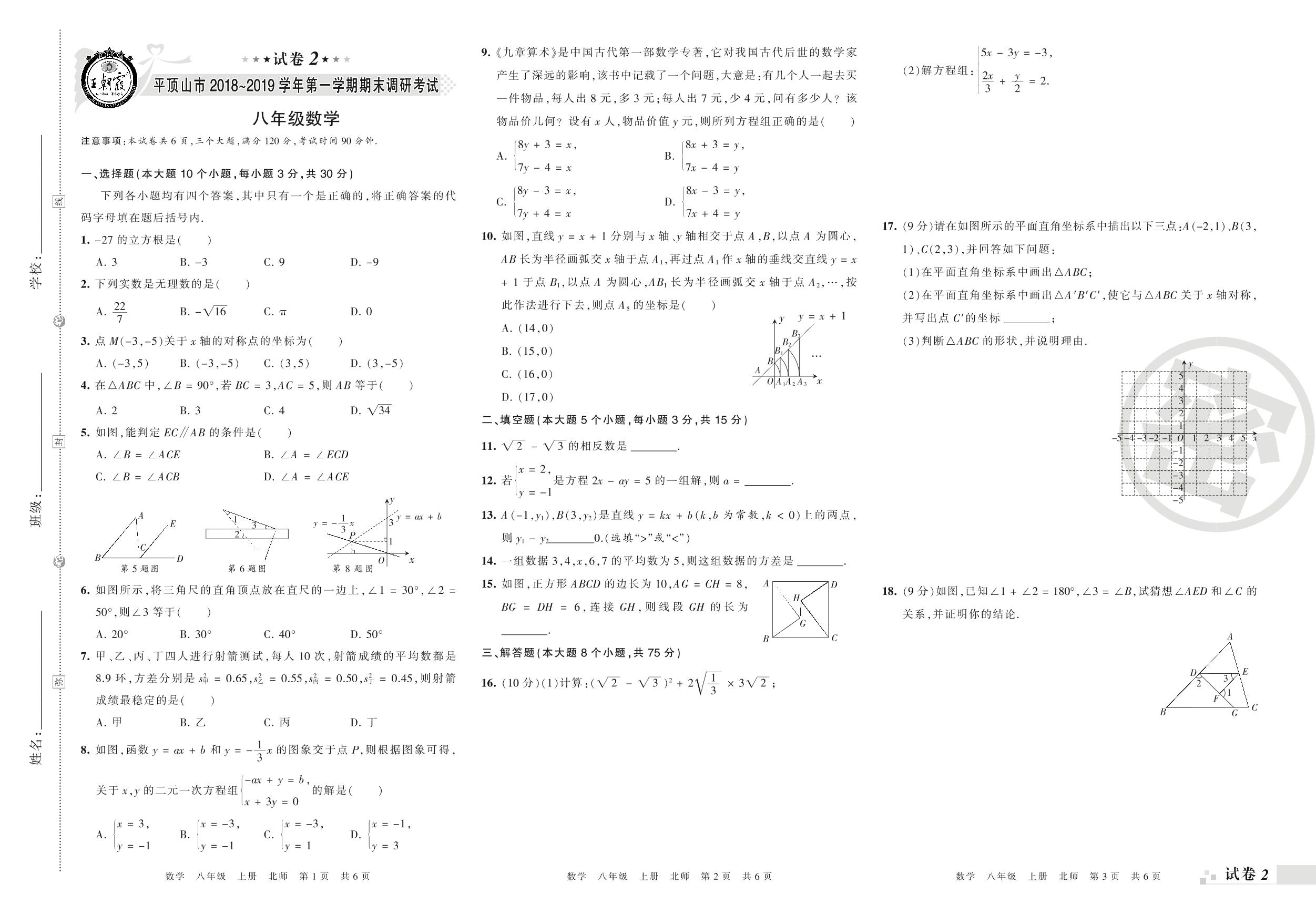 2018-2019学年第一学期平顶山市八年级数学试卷(北师版)【2】