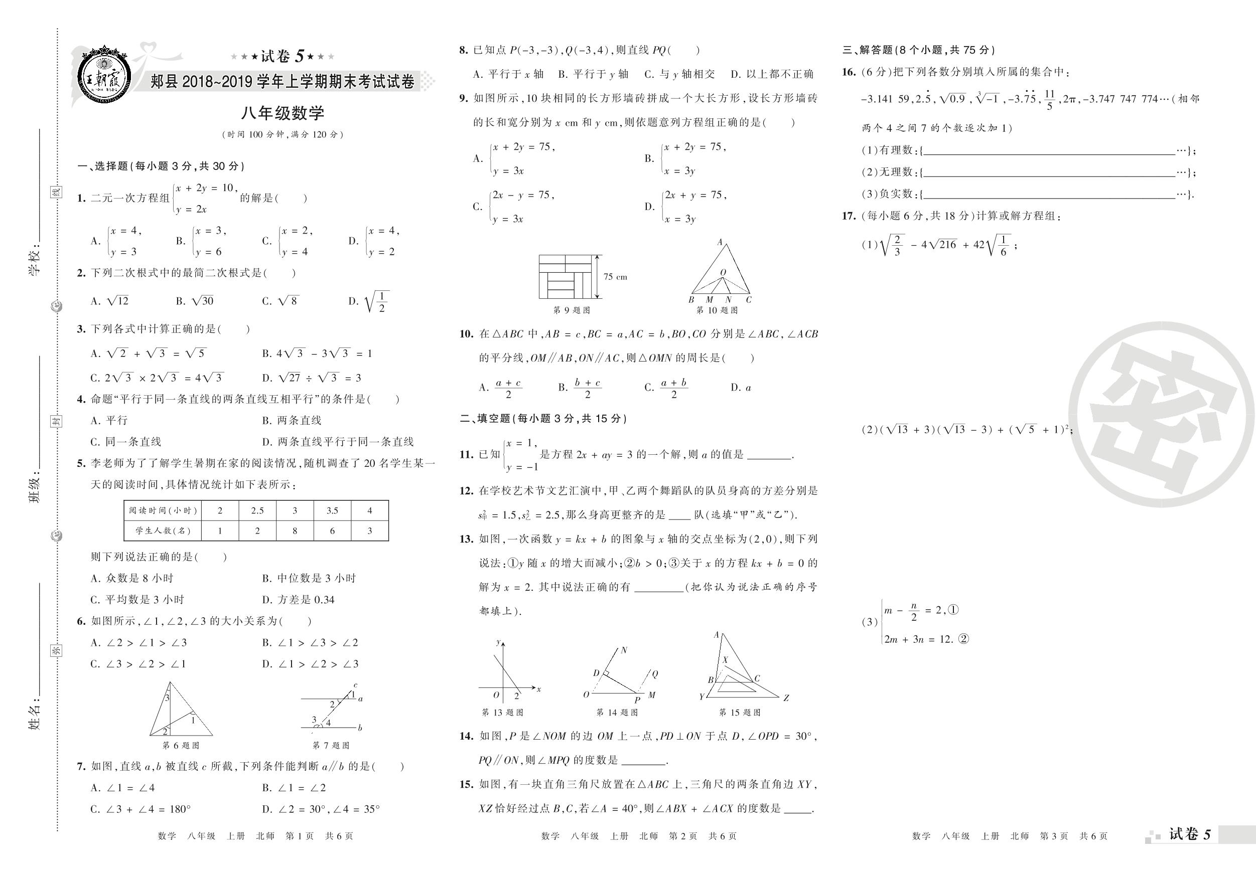 2018-2019学年第一学期平顶山市郏县八年级数学试卷(北师版)【5】