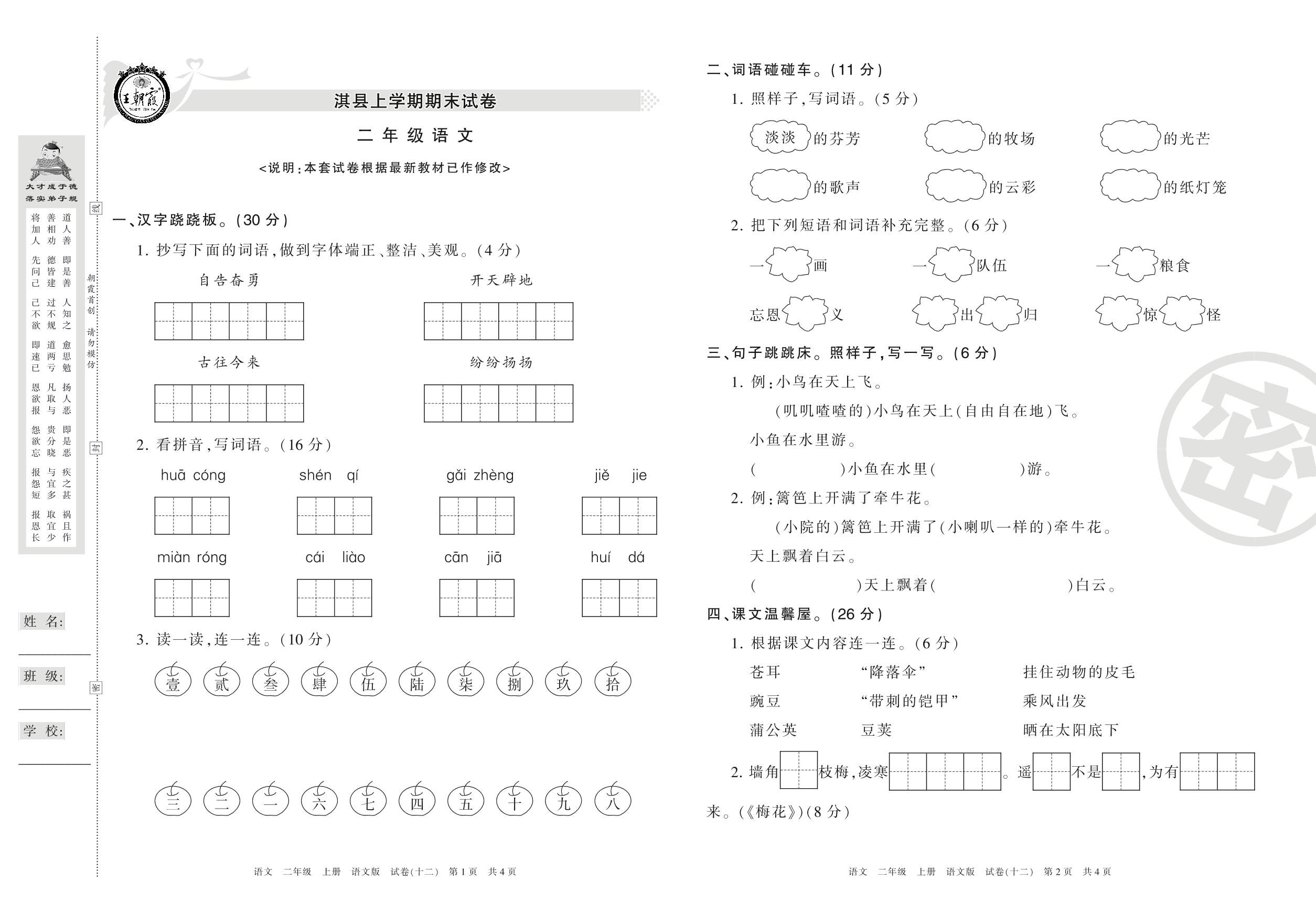 2016-2017学年第一学期鹤壁市淇县二年级语文试卷(语文版)【12】
