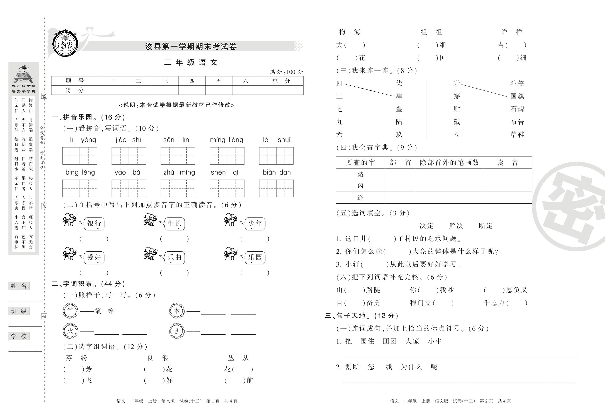 2016-2017学年第一学期鹤壁市浚县二年级语文试卷(语文版)【13】