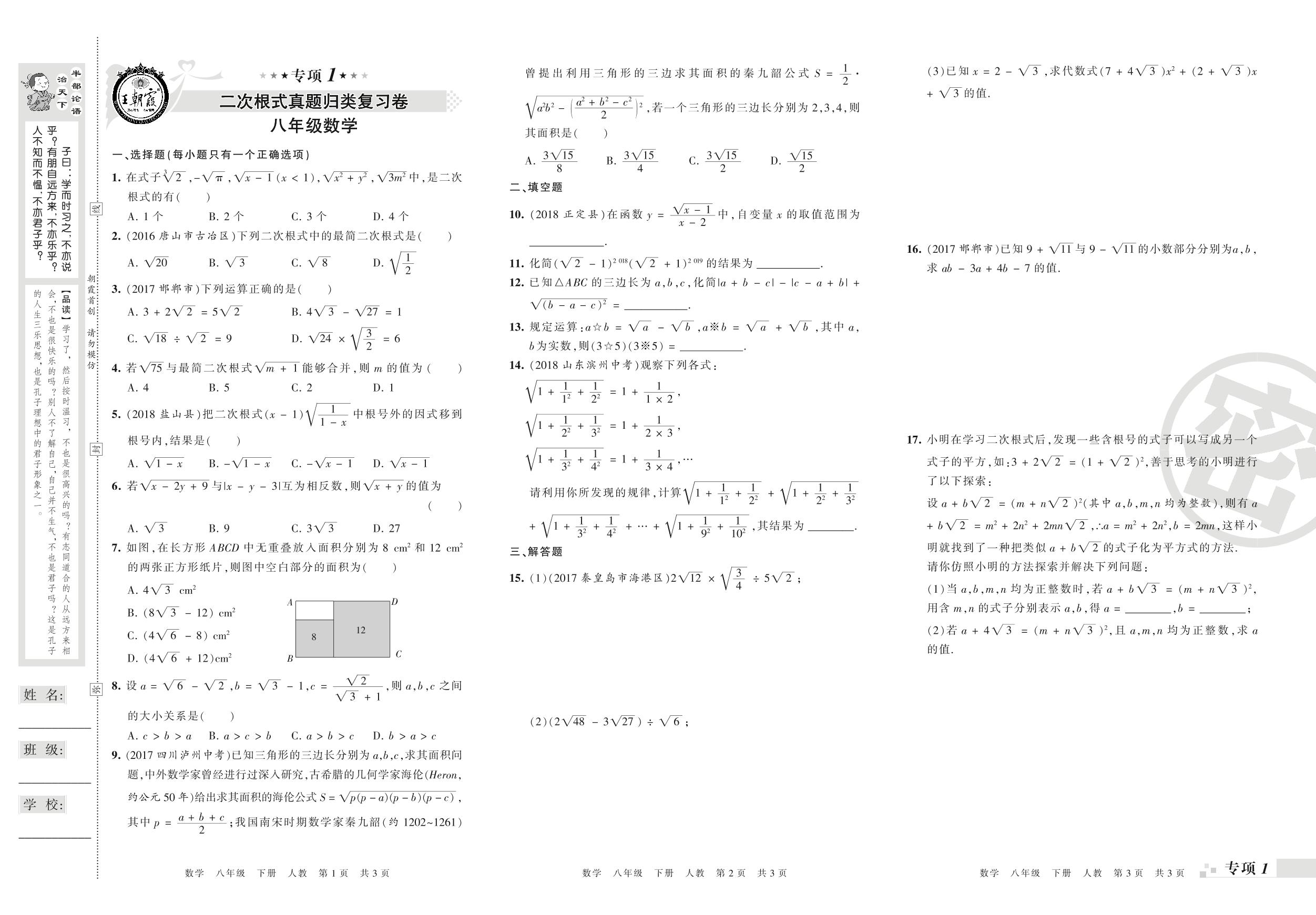 王朝霞期末专项卷——二次根式、勾股定理真题归类复习卷八年级下册数学(人教版)_R210806103139【0】