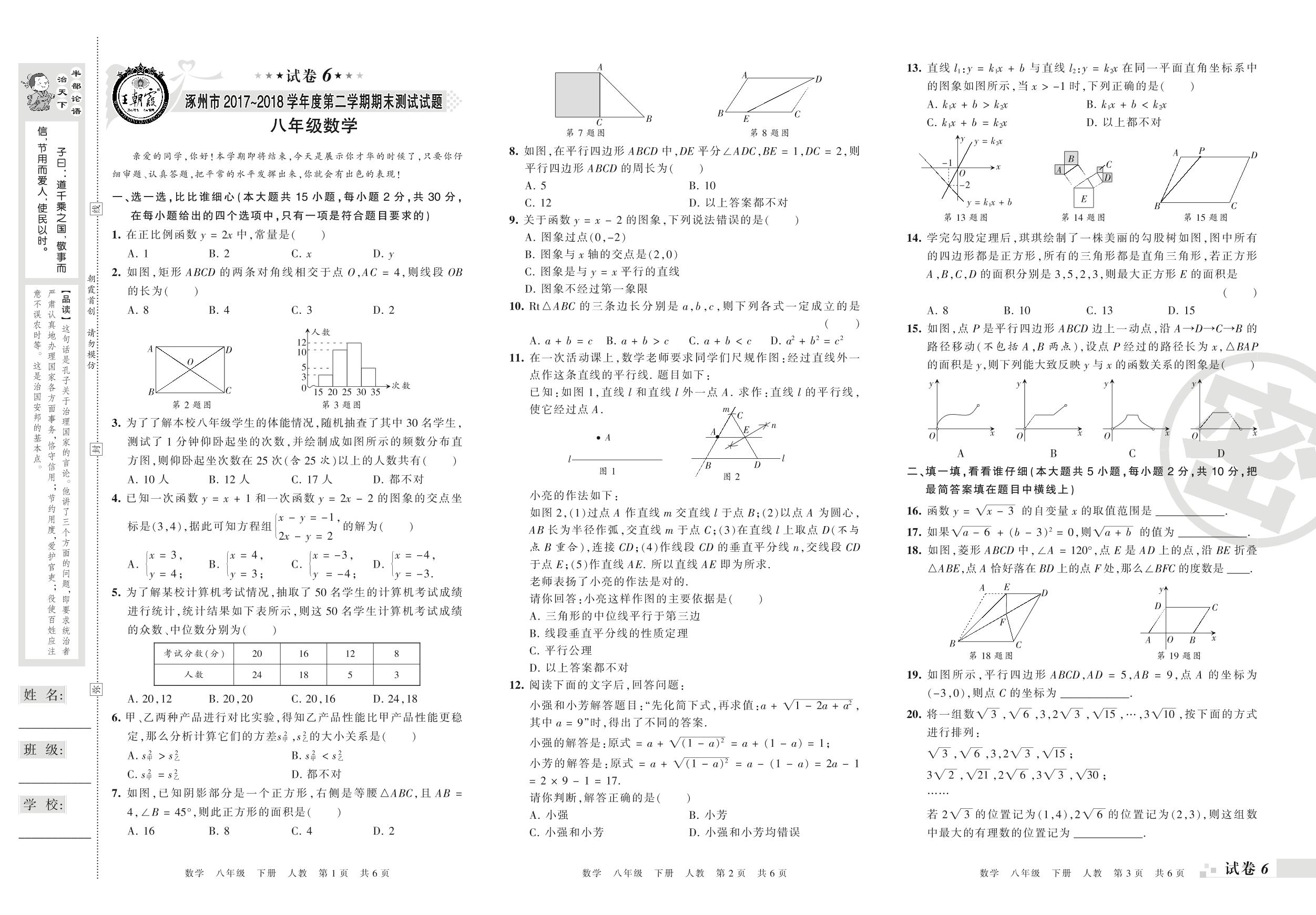 2017-2018学年第二学期涿州市八年级数学试卷(人教版)【6】