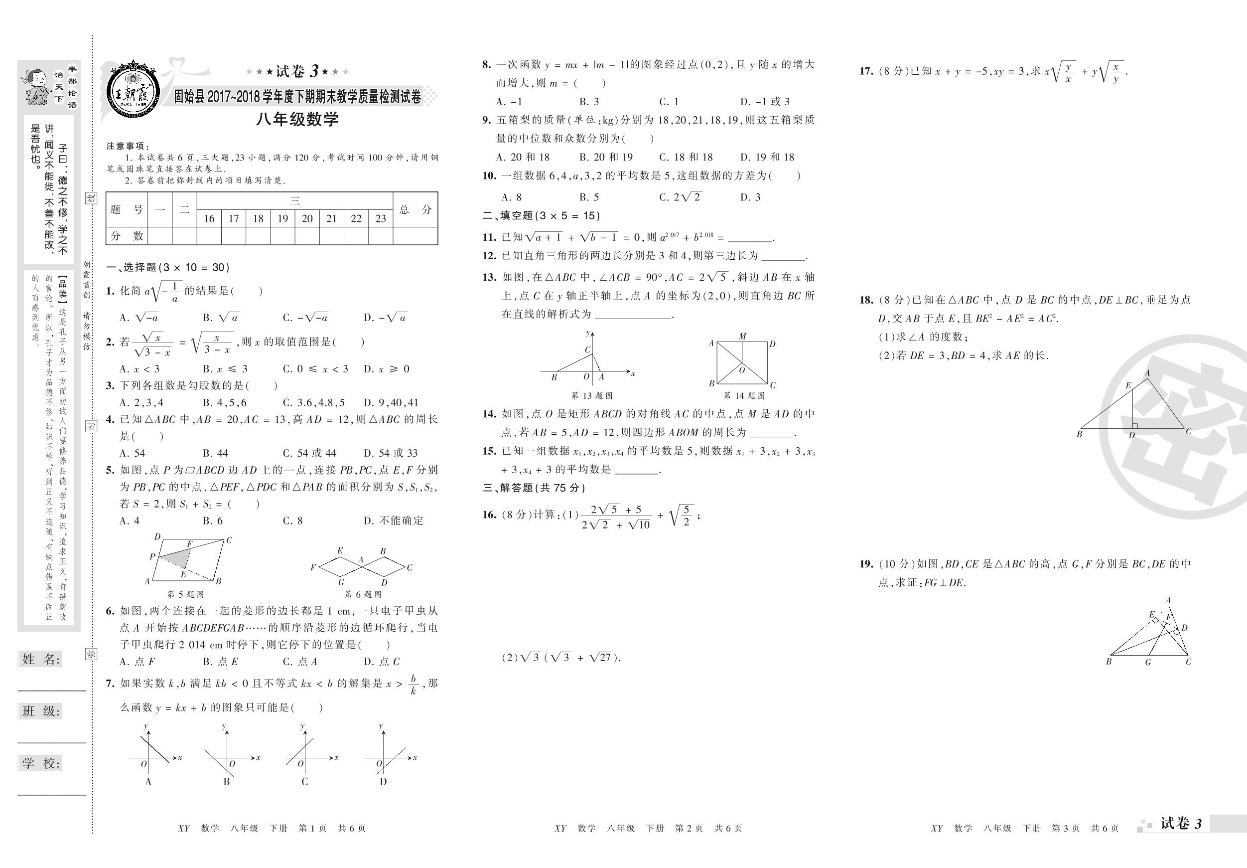 2017-2018学年第二学期信阳市固始县八年级数学试卷(人教版)【3】