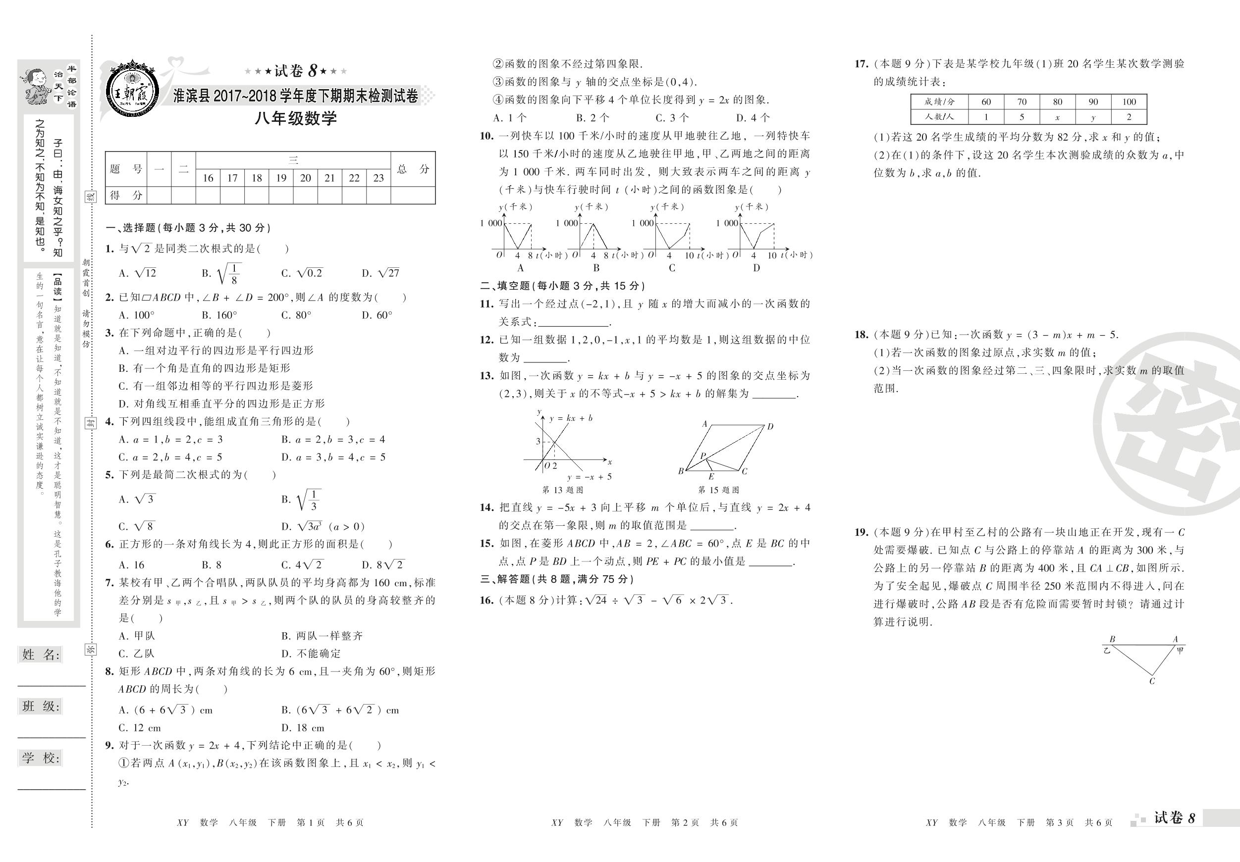 八年级数学人教版下册期末卷
