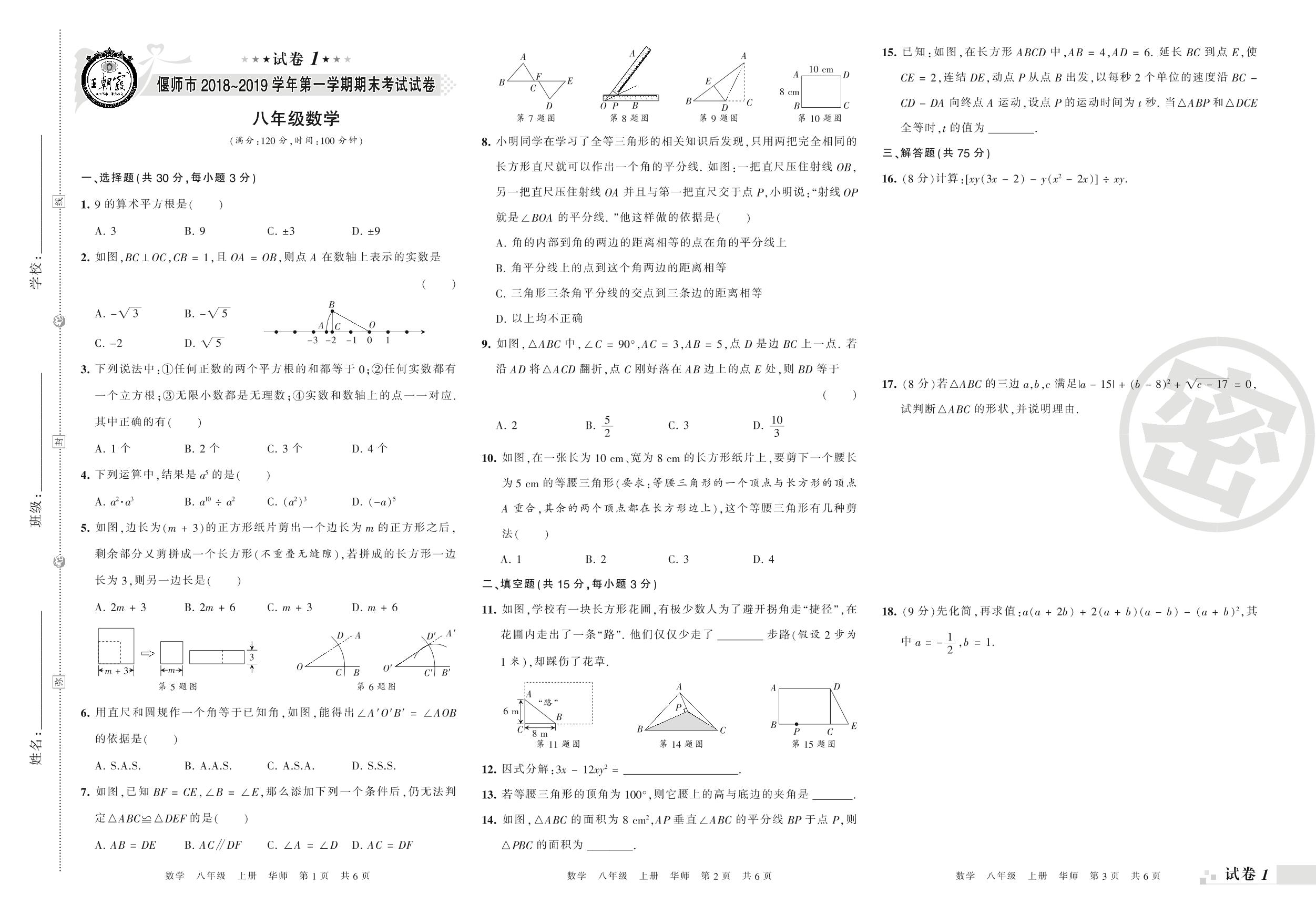 2018-2019学年第一学期偃师市八年级数学试卷(华师版)【1】