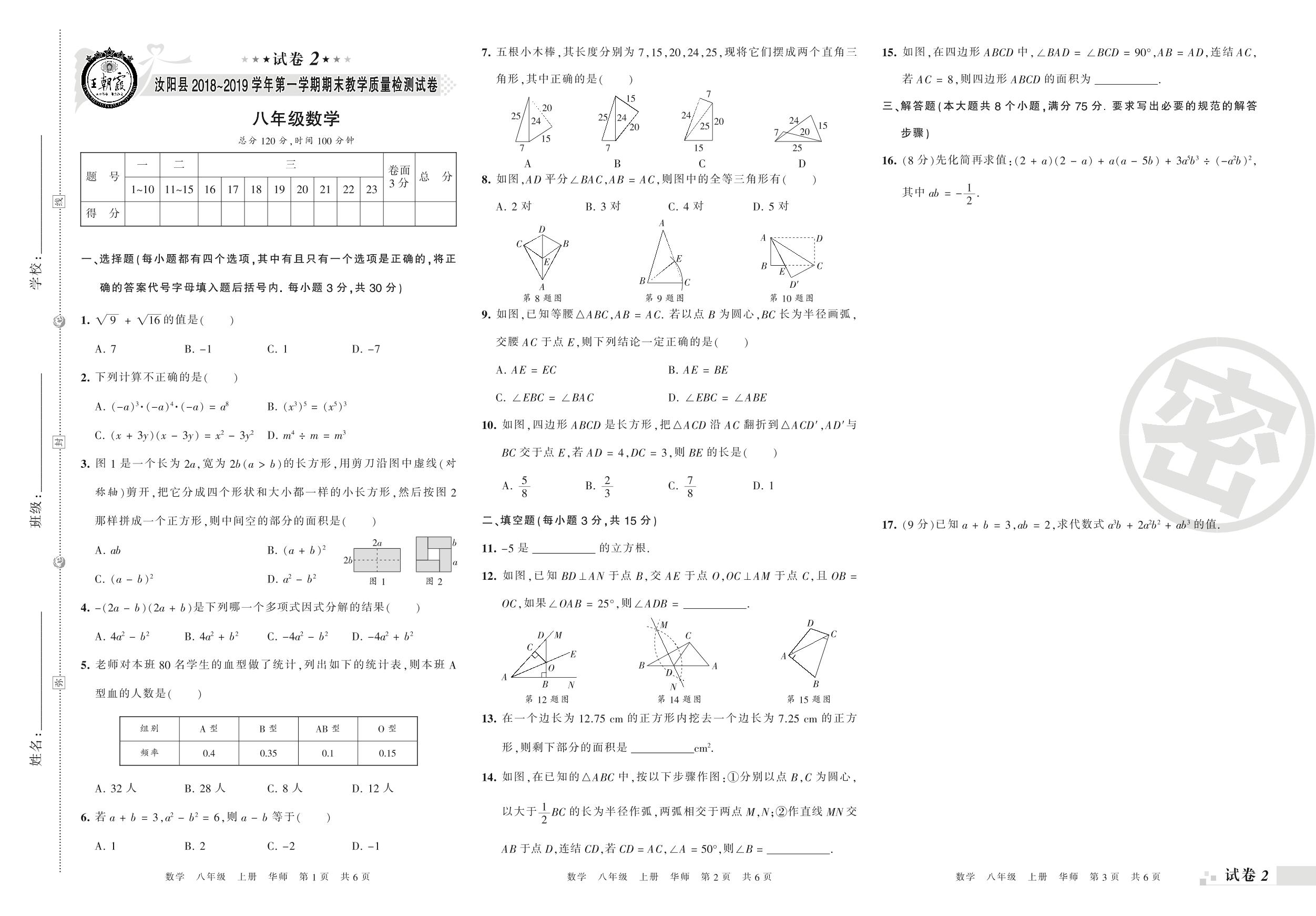 2018-2019学年第一学期洛阳市汝阳县八年级数学试卷(华师版)【2】