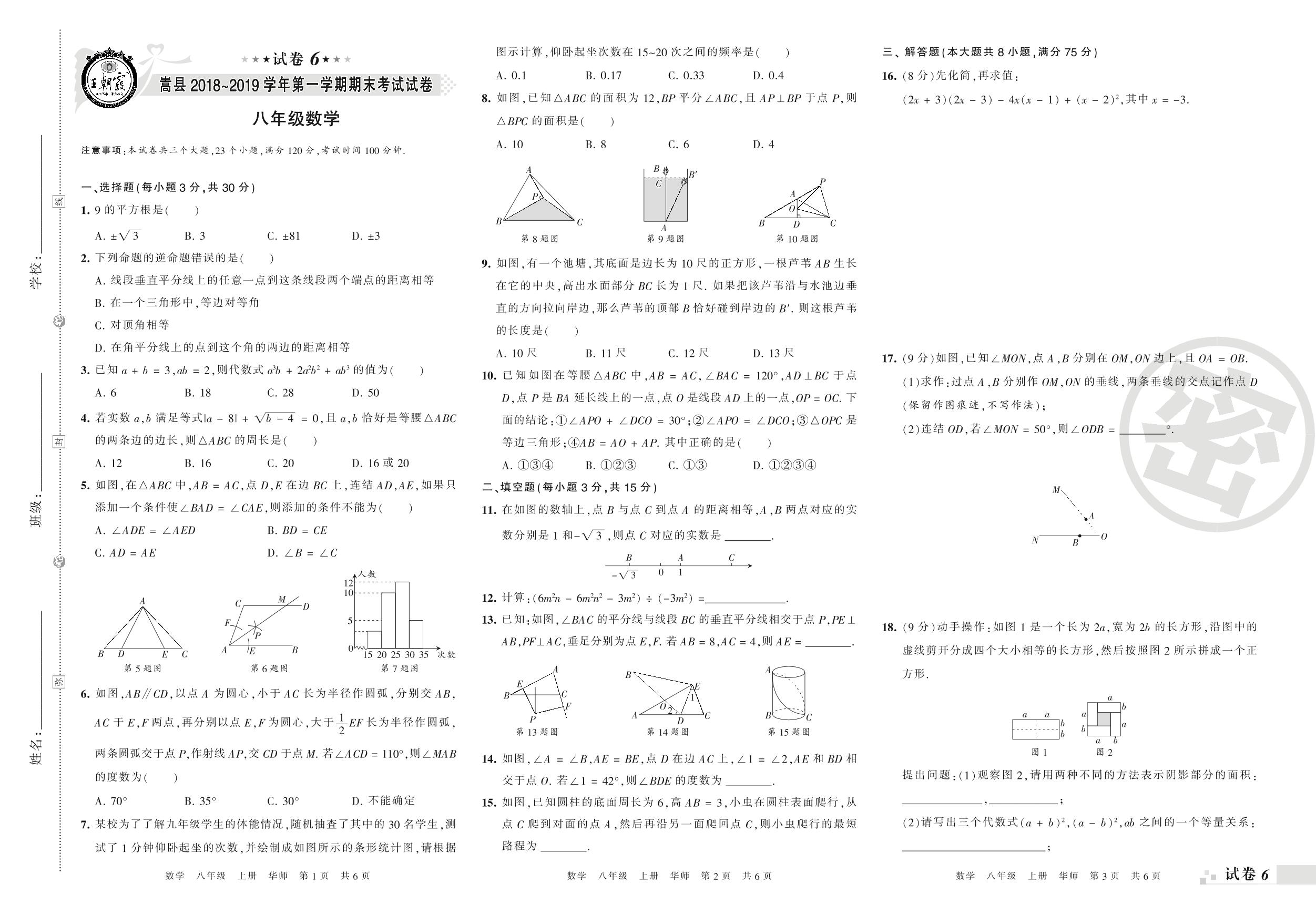 2018-2019学年第一学期洛阳市嵩县八年级数学试卷(华师版)【6】