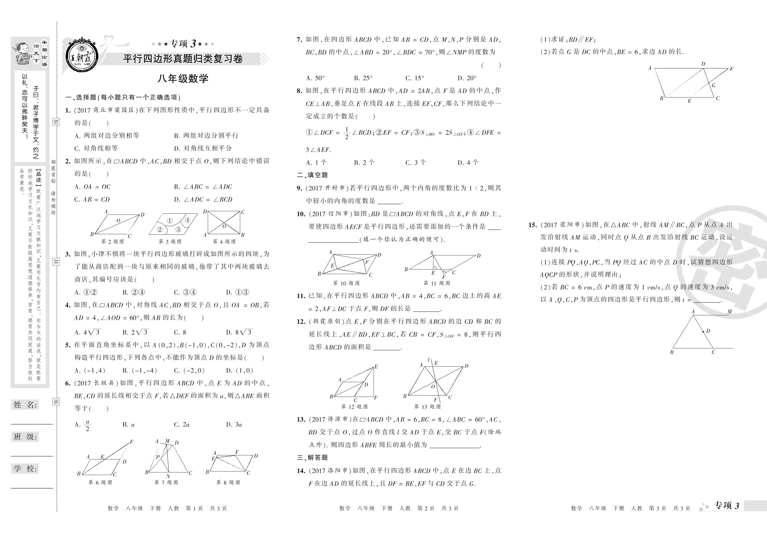 王朝霞期末专项卷——平行四边形、特殊的平行四边形(一)真题归类复习卷八年级下册数学(人教版)_R210806103708【0】