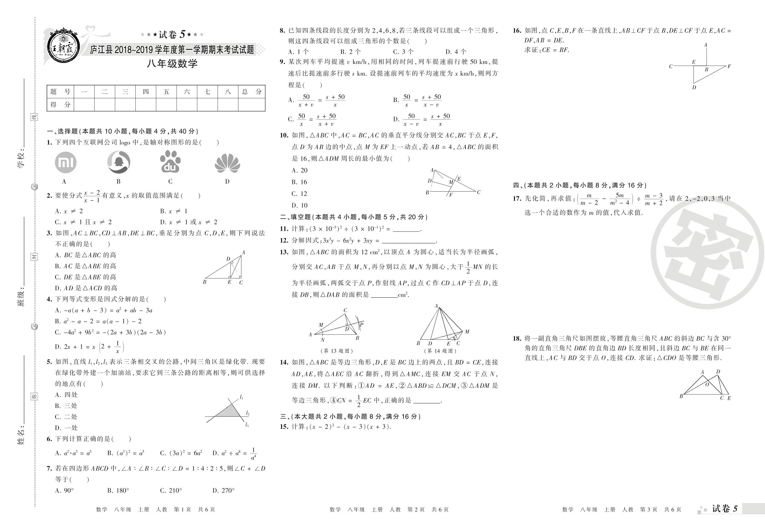 2018-2019学年第一学期合肥市庐江县八年级数学试卷(人教版)【5】
