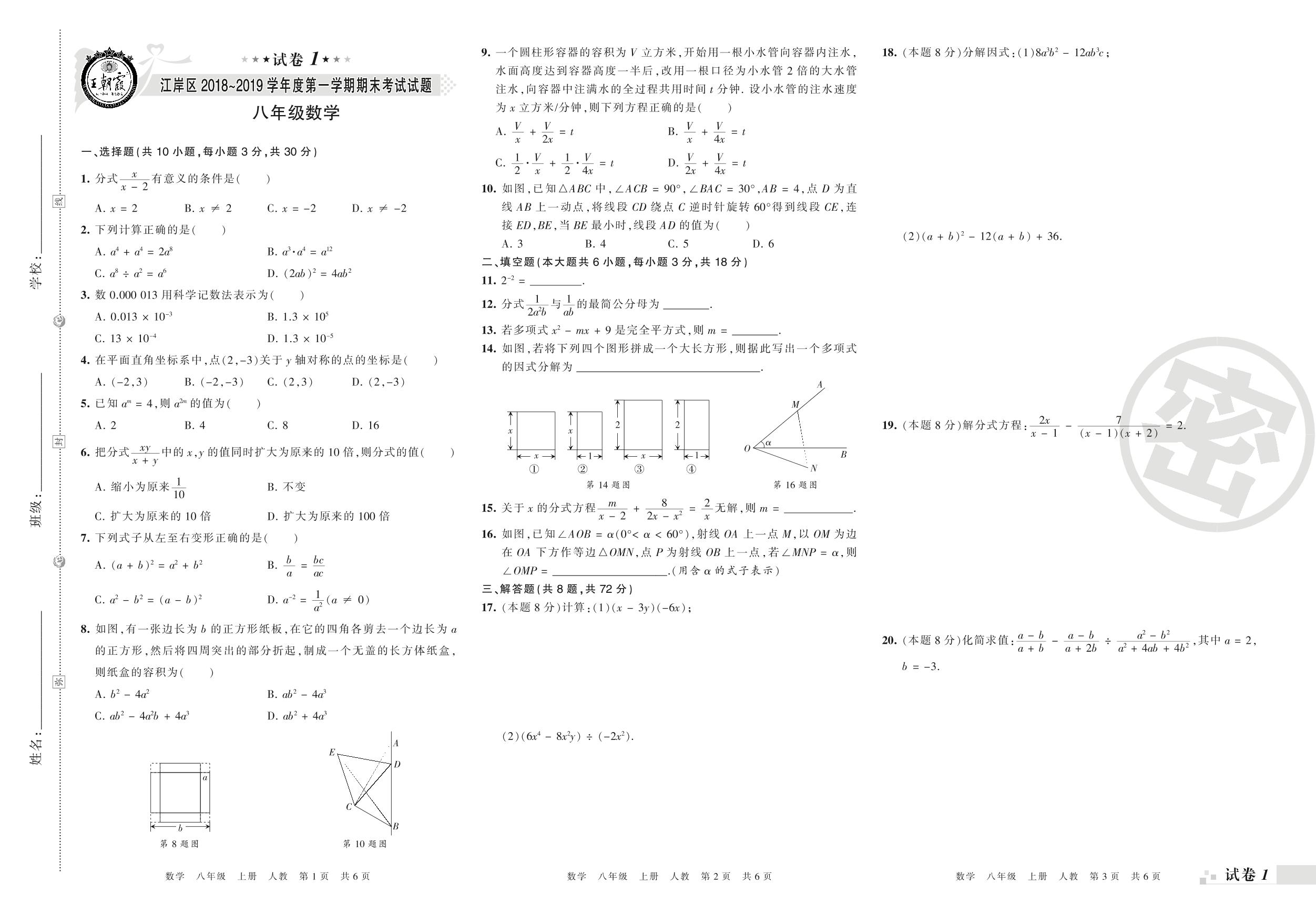 2018-2019学年第一学期武汉市江岸区八年级数学试卷(人教版)【1】