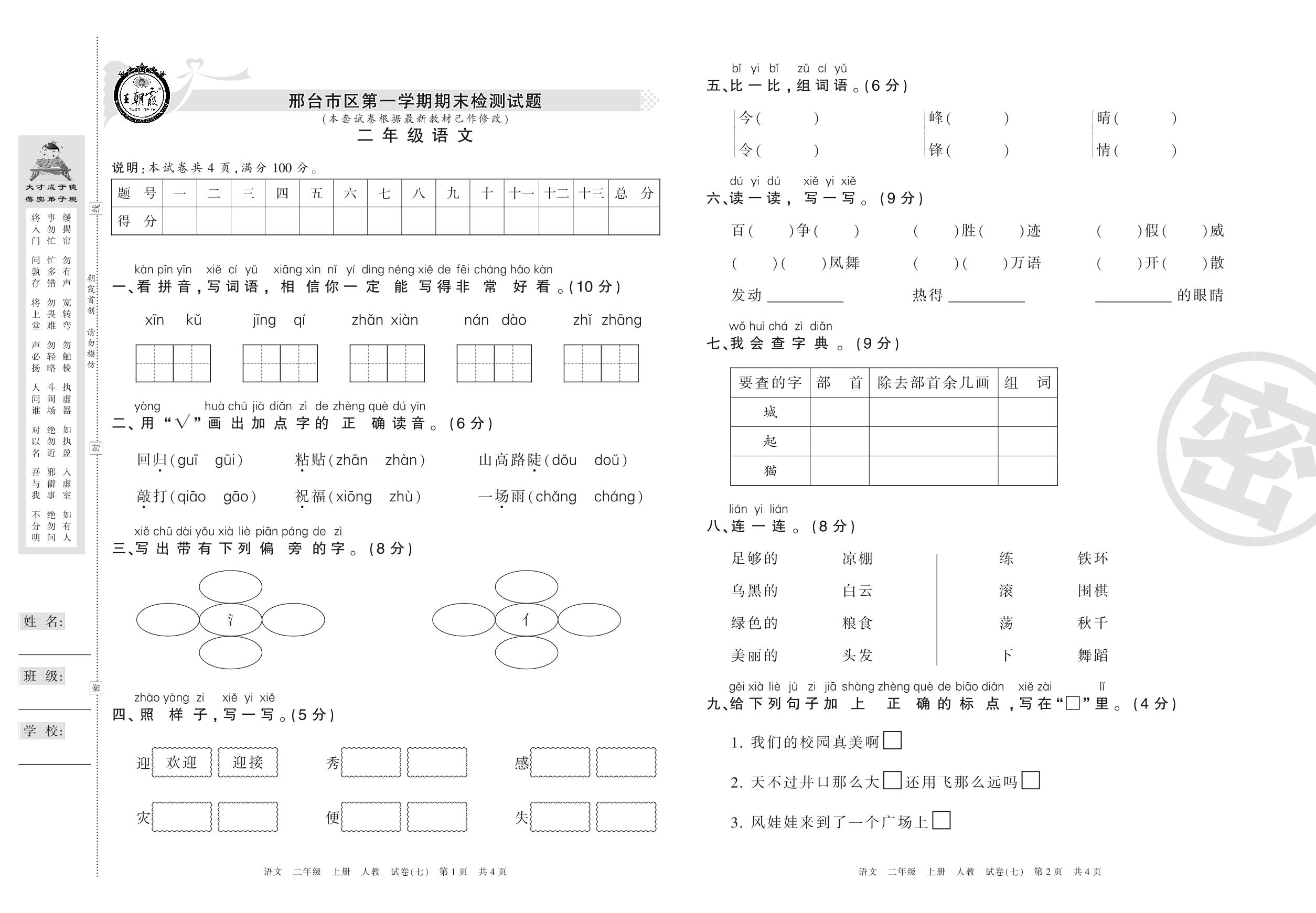 2016-2017学年第一学期邢台市区二年级语文试卷(人教版)【7】