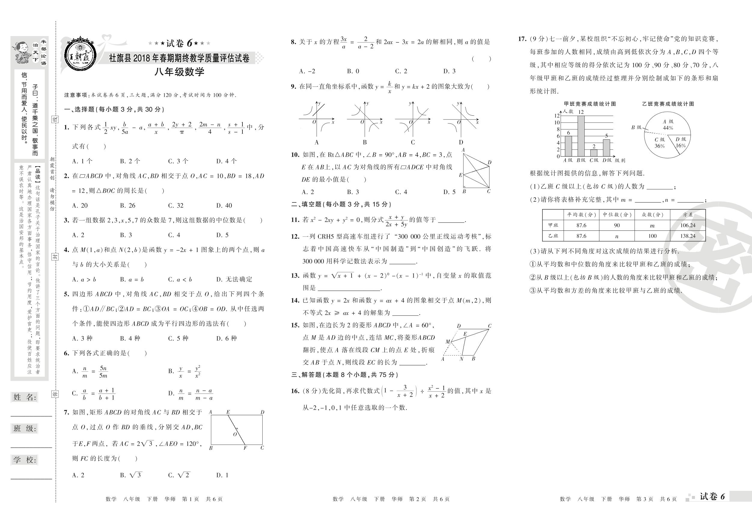 2017-2018学年第二学期南阳市社旗县八年级数学试卷(华师版)【6】