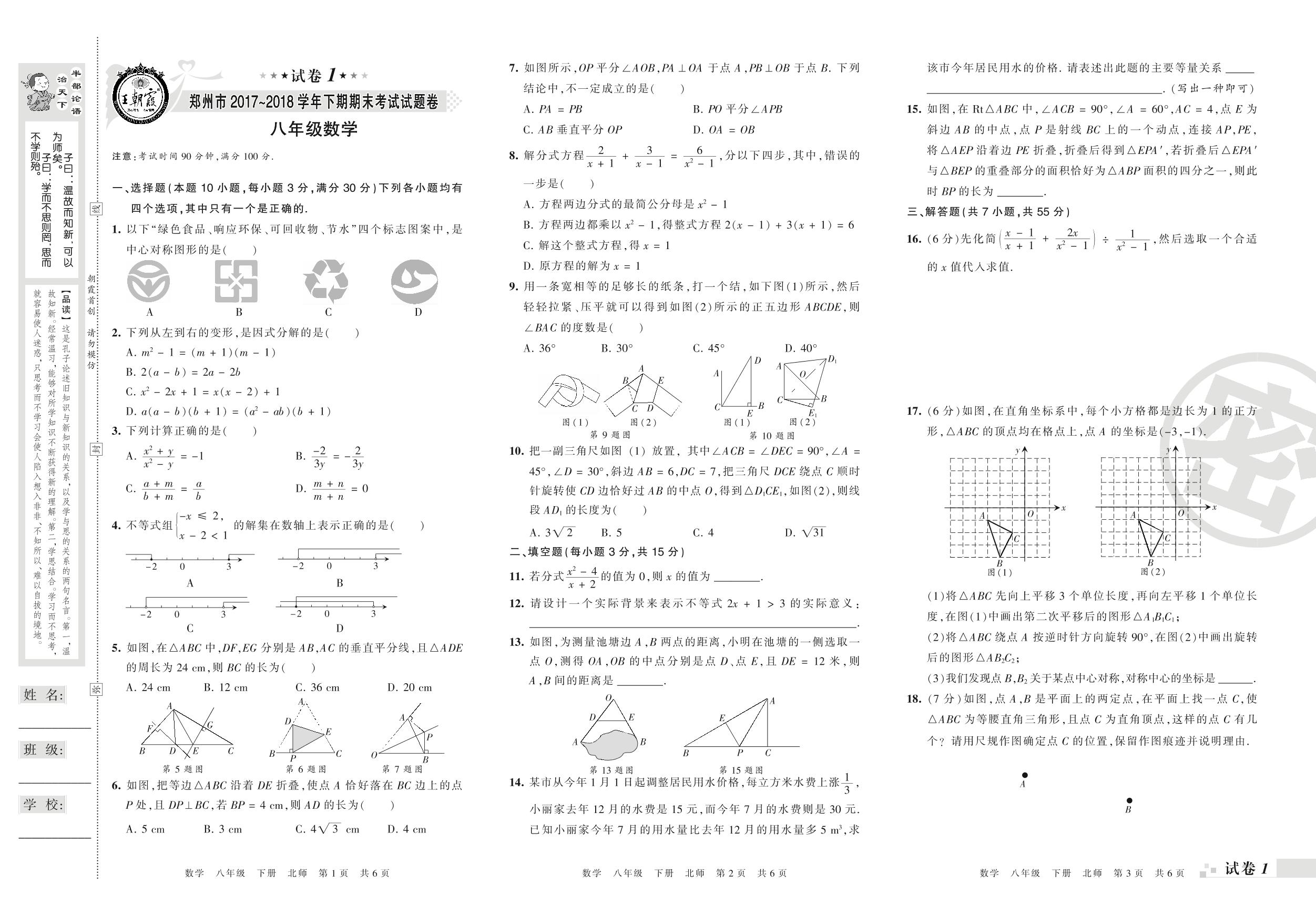 2017-2018学年第二学期郑州市八年级数学试卷(北师版)_R210806104434【1】
