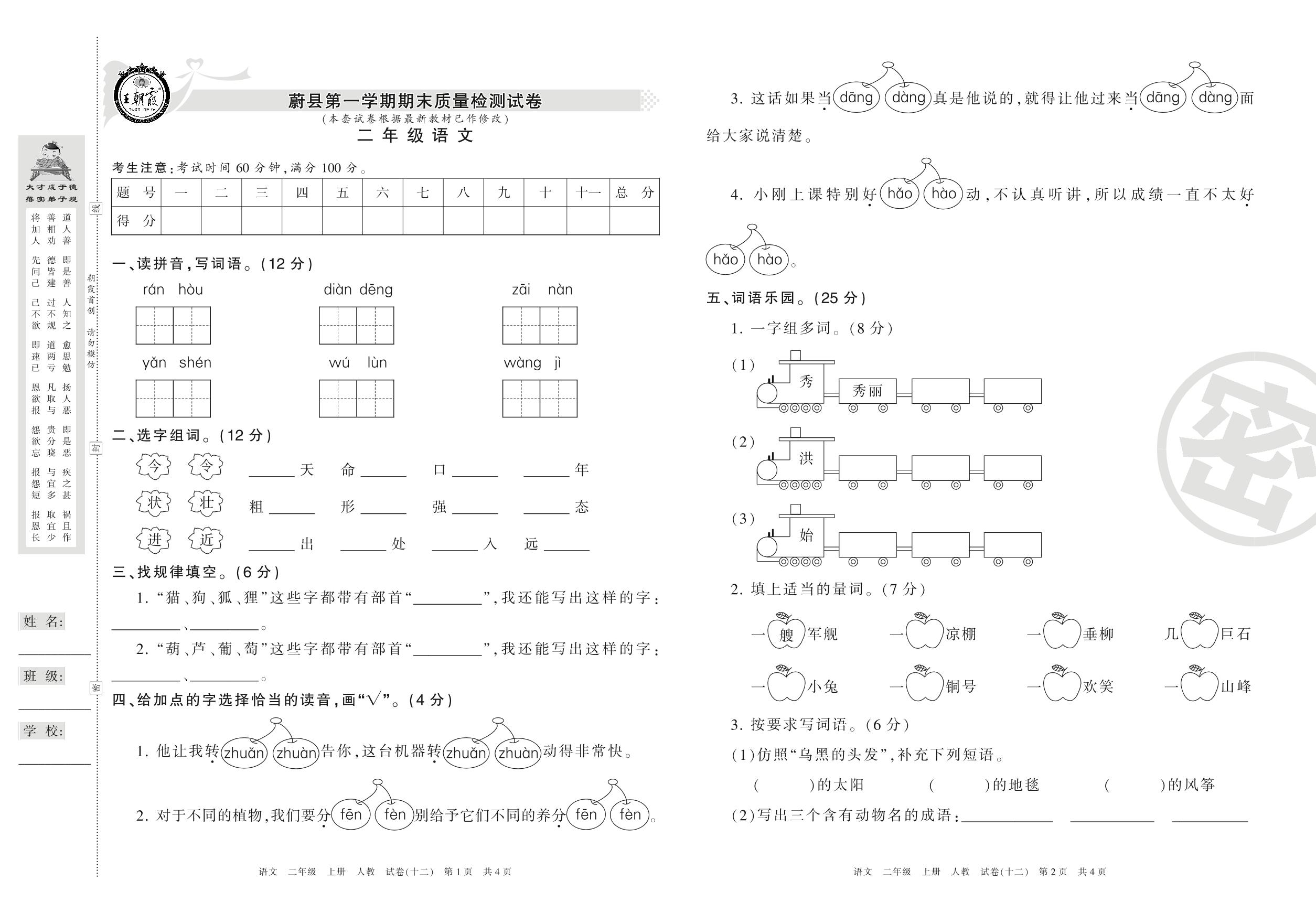 2016-2017学年第一学期张家口市蔚县二年级语文试卷(人教版)【12】