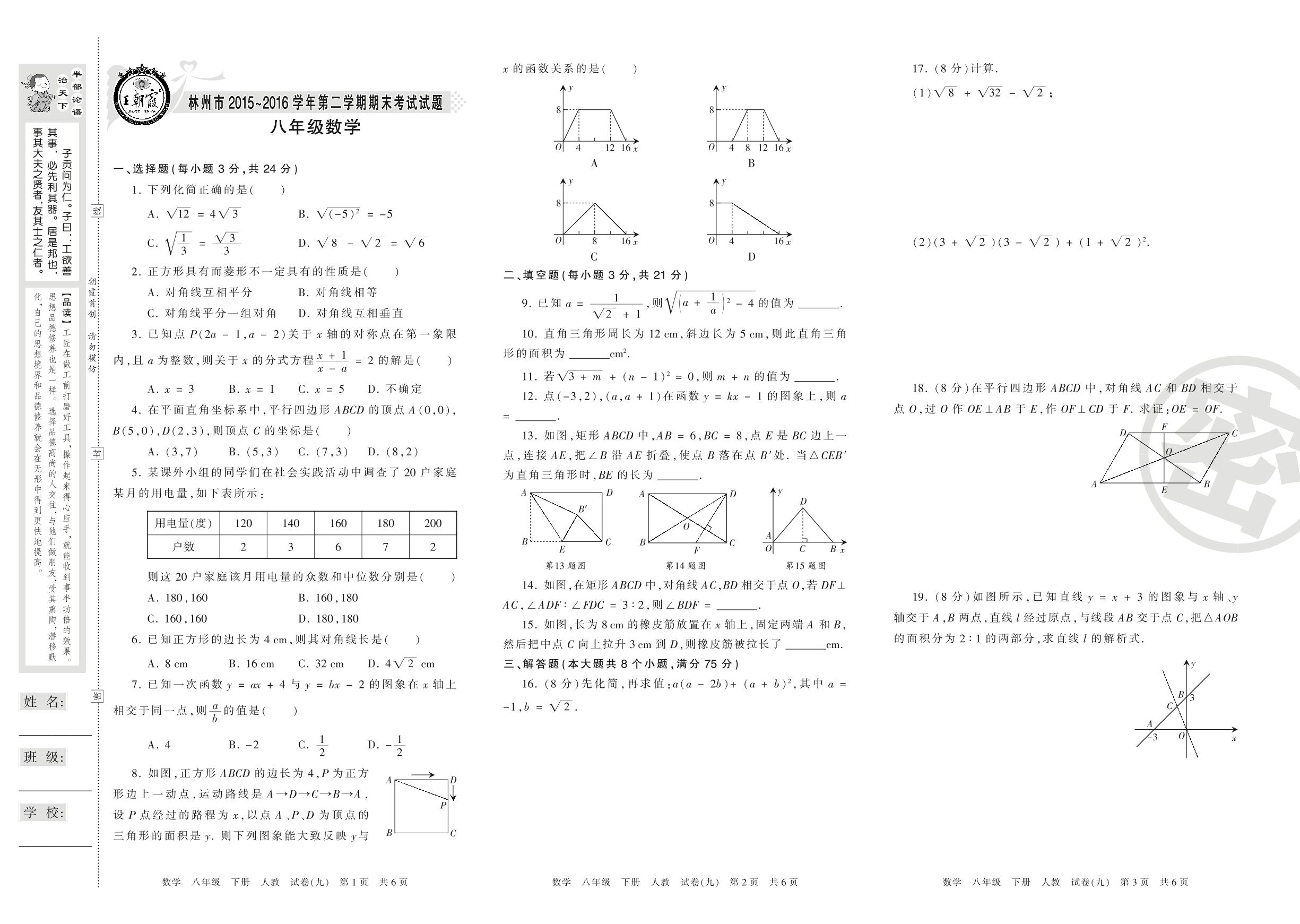 2015-2016学年第二学期林州市八年级数学试卷(人教版)【9】