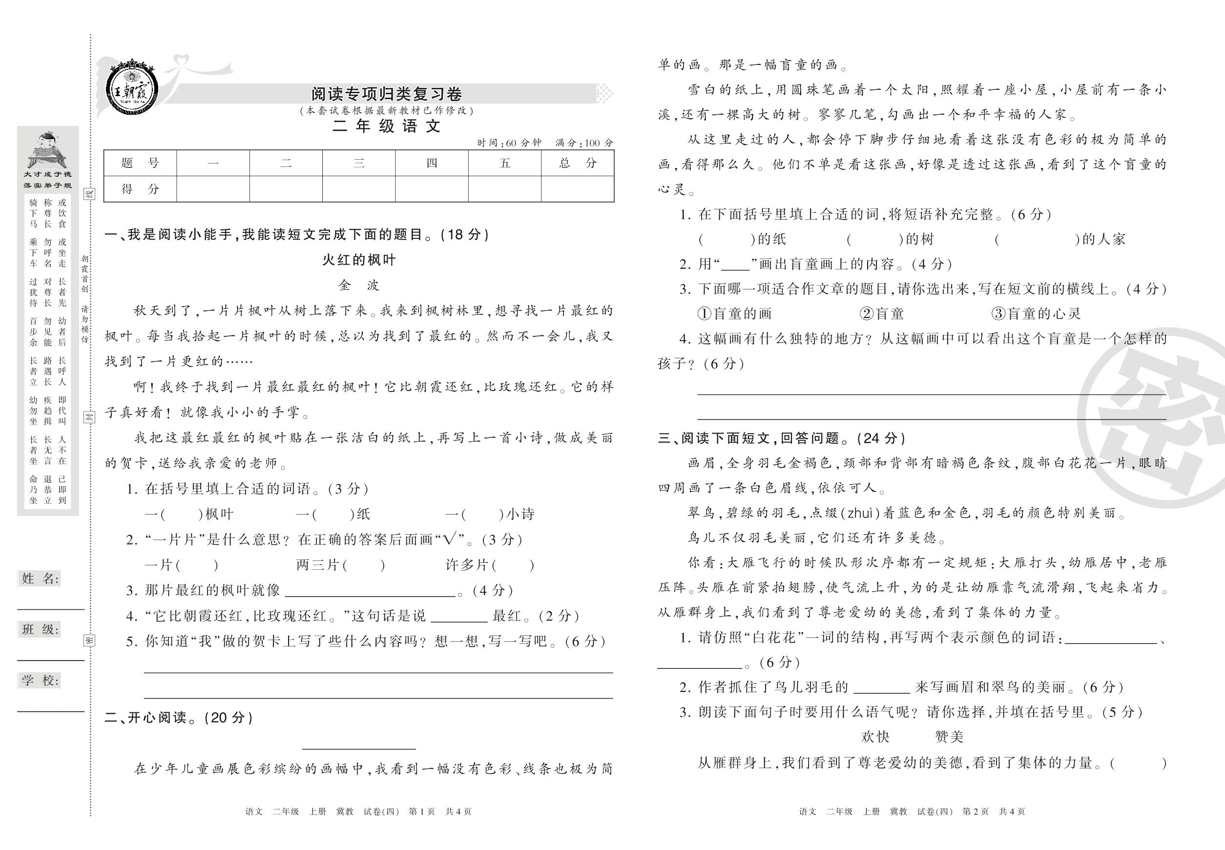 王朝霞期末专项卷二年级上册语文(冀教版)【4】