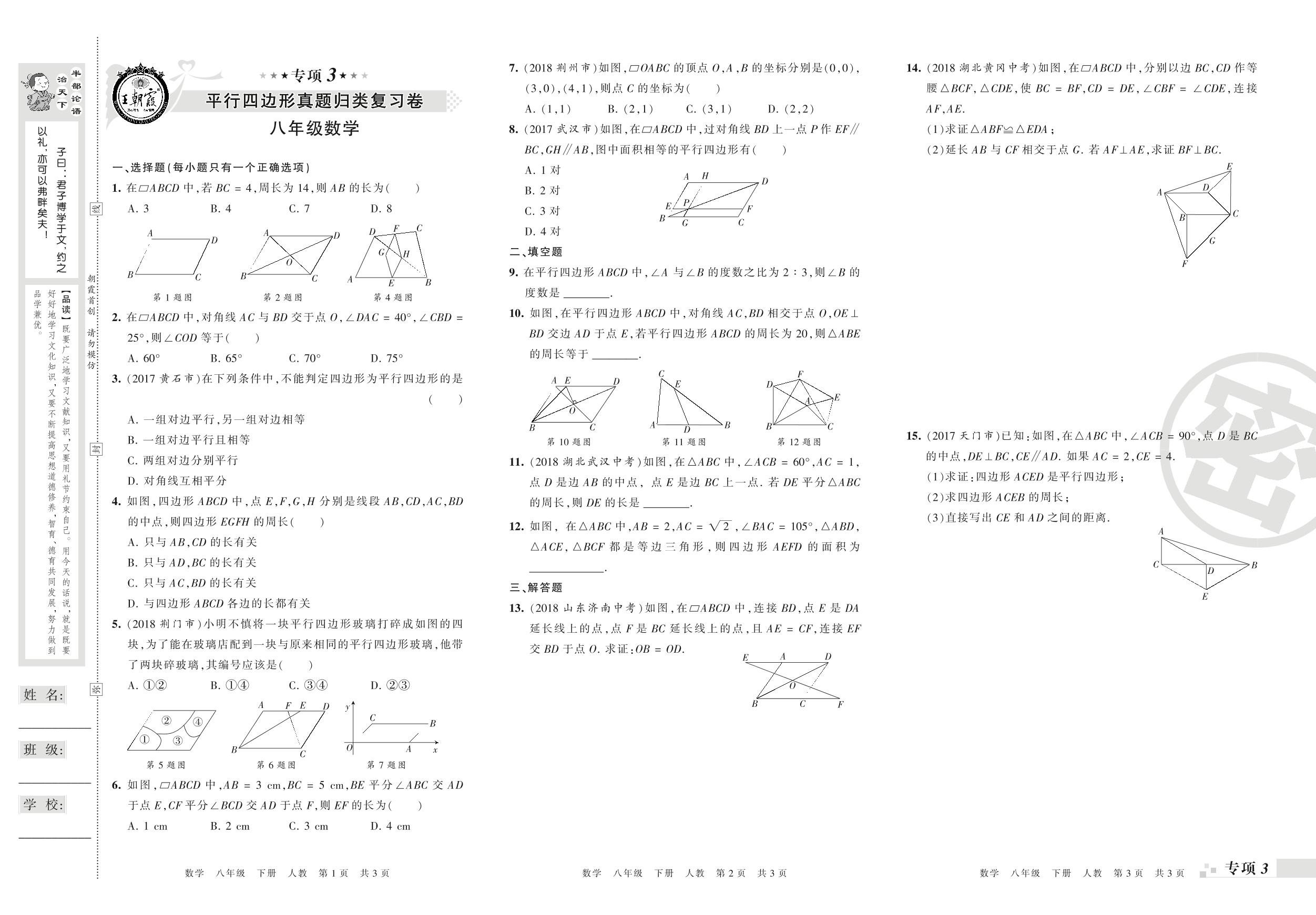 王朝霞期末专项卷——平行四边形、特殊的平行四边形(一)真题归类复习卷八年级下册数学(人教版)_R210806105447【0】