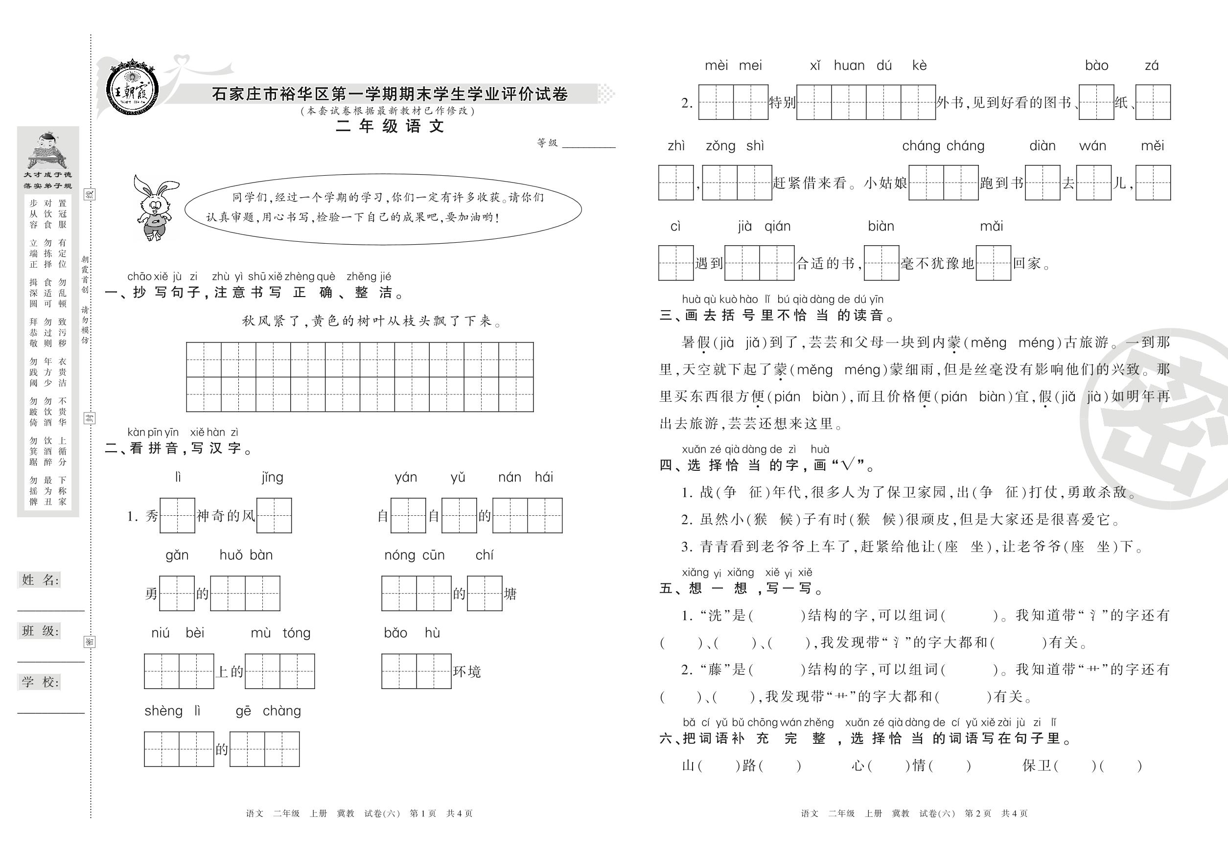 2016-2017学年第一学期石家庄市裕华区二年级语文试卷(冀教版)【6】