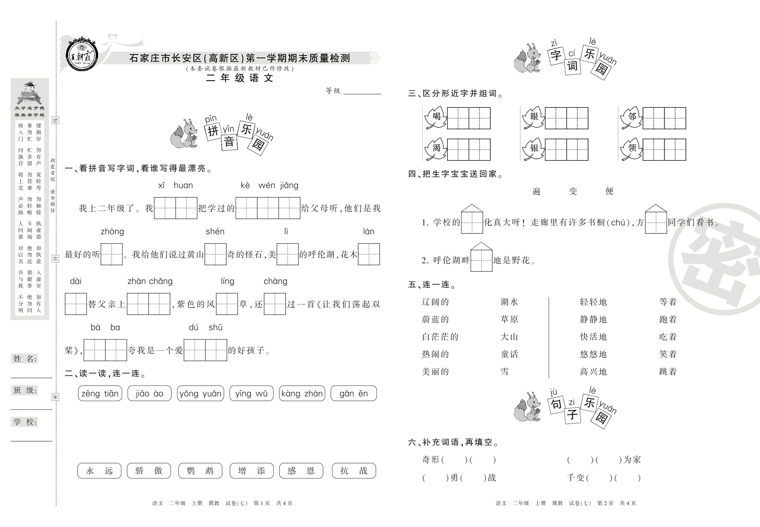 2016-2017学年第一学期石家庄市长安区(高新区)二年级语文试卷(冀教版)【7】