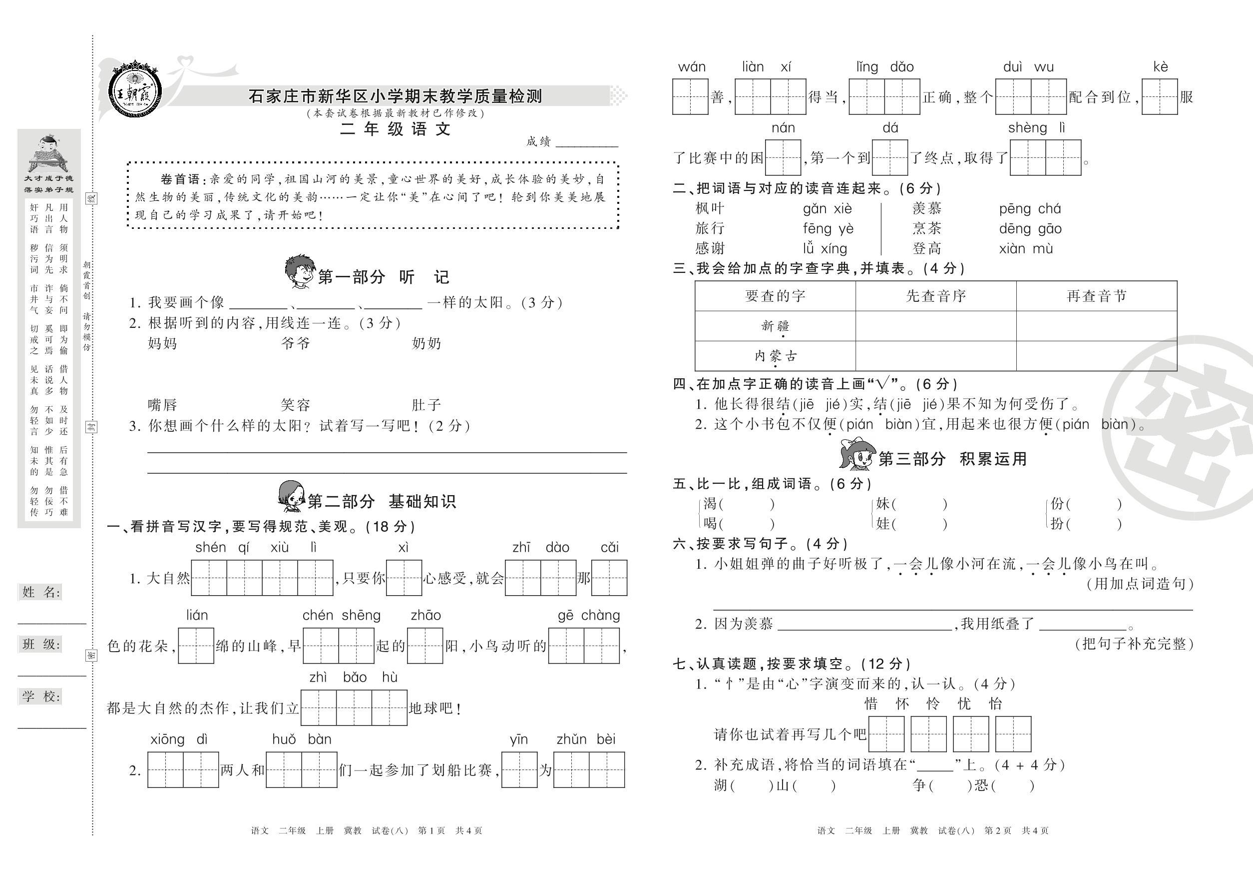 2016-2017学年第一学期石家庄市新华区二年级语文试卷(冀教版)【8】