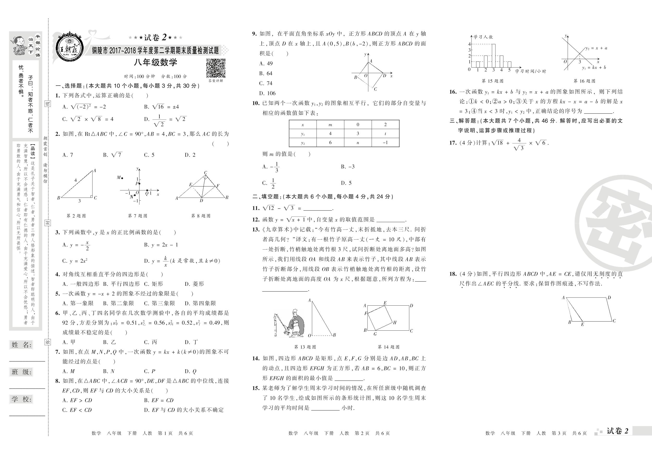 2017-2018学年第二学期铜陵市八年级数学试卷(人教版)【2】