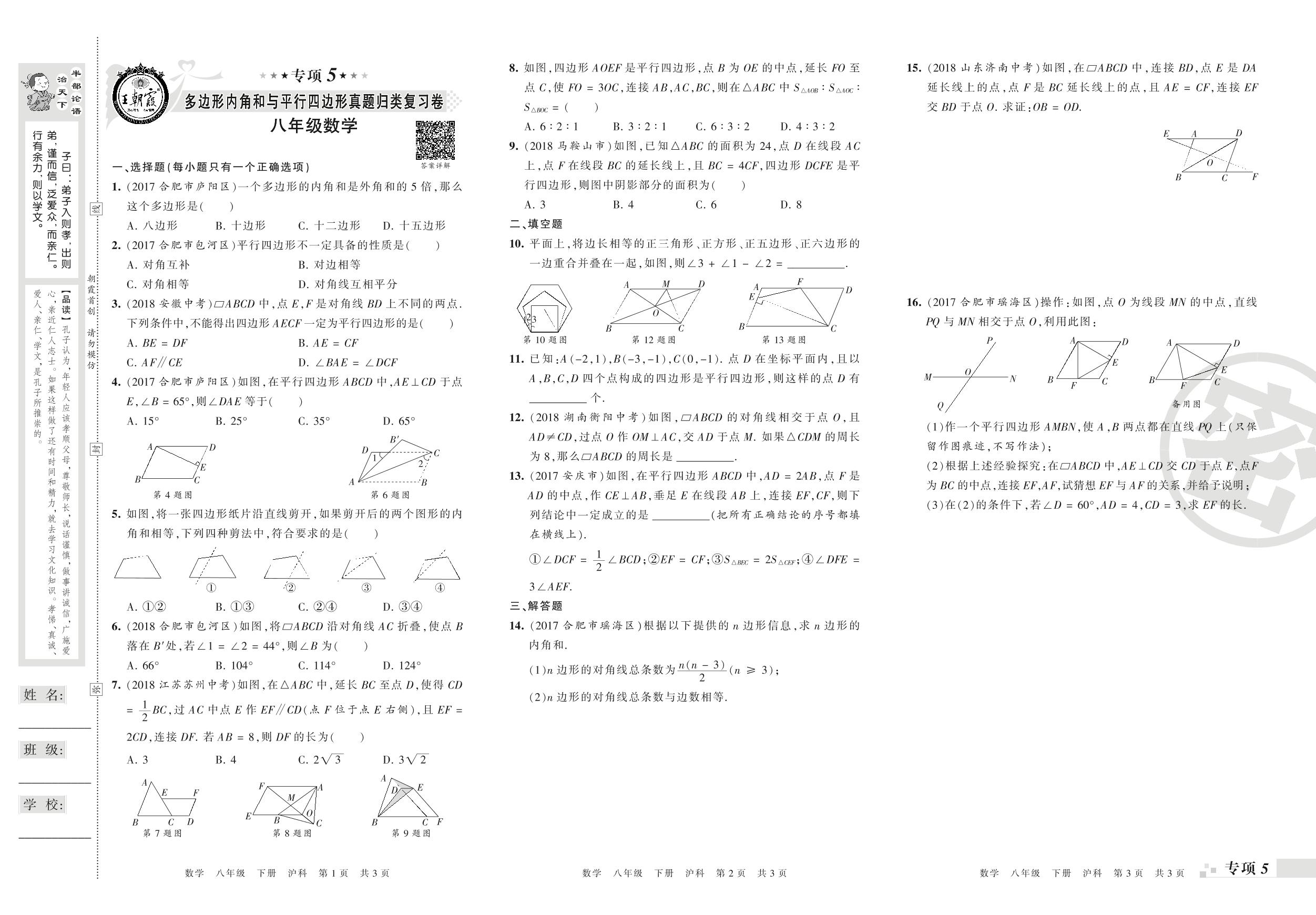 王朝霞期末专项卷——多边形内角和与平行四边形、特殊的平行四边形(一)真题归类复习卷八年级下册数学(沪科版)_R210806110216【0】