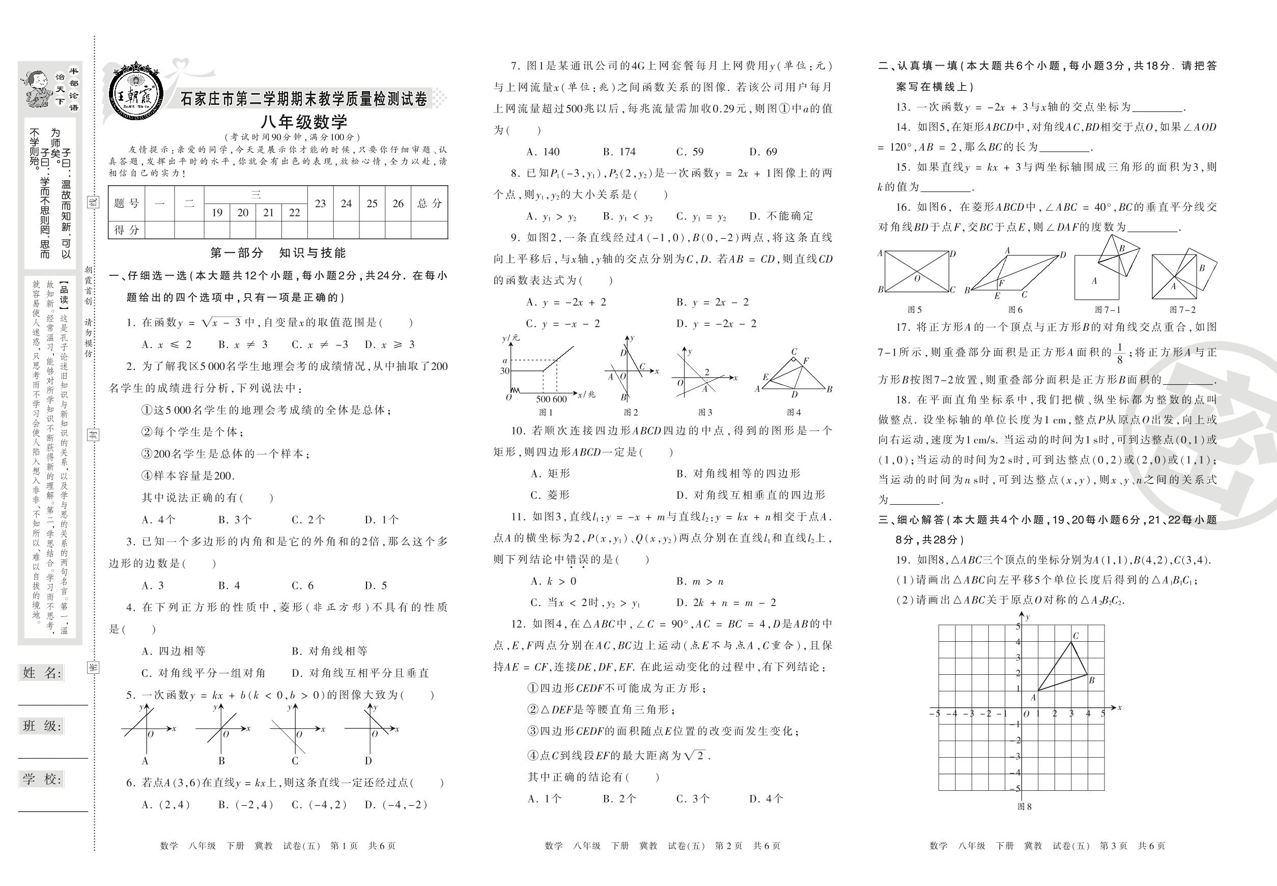 2015-2016学年第二学期石家庄市八年级数学试卷(冀教版)【5】