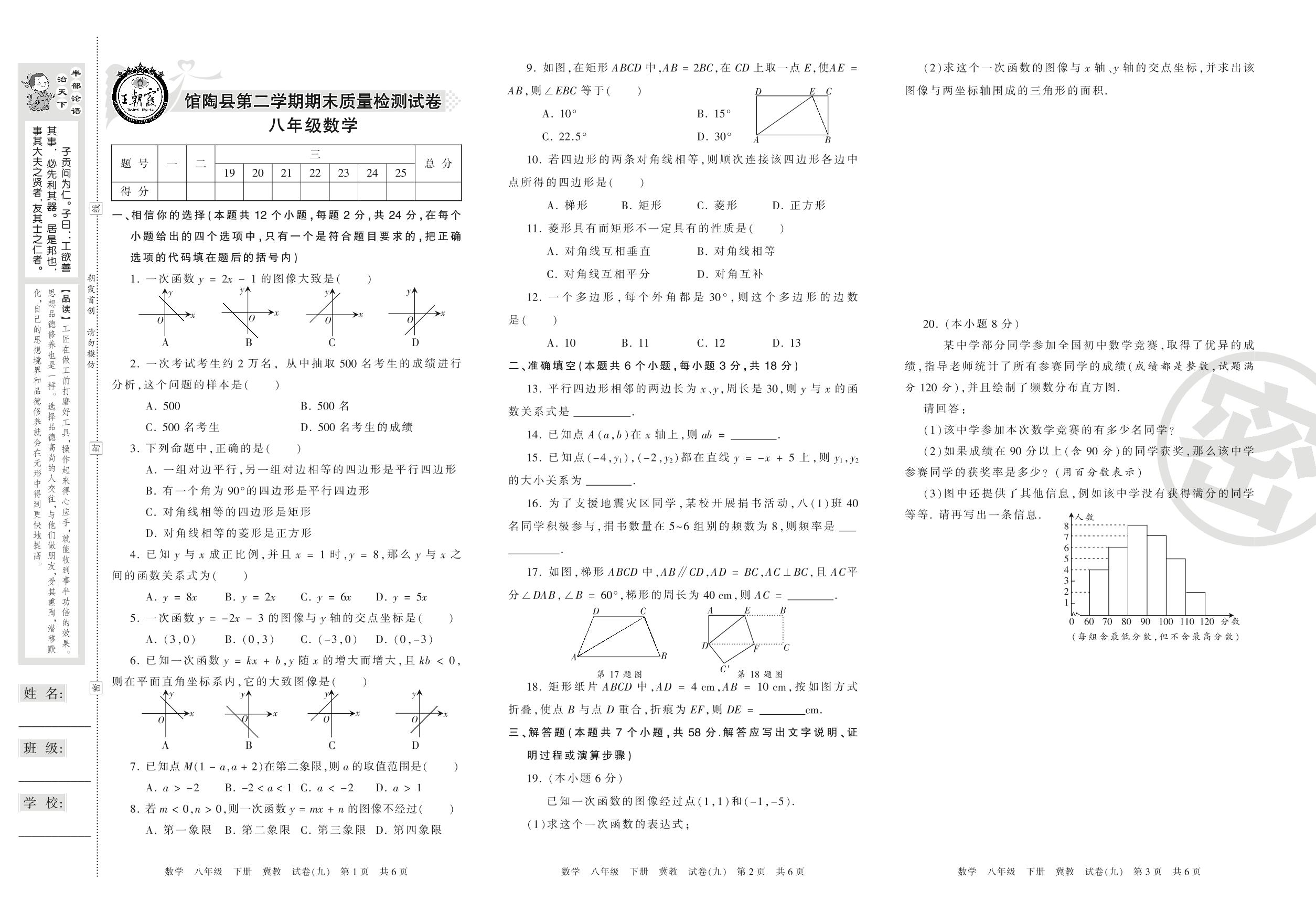 八年级数学冀教版下册期末卷