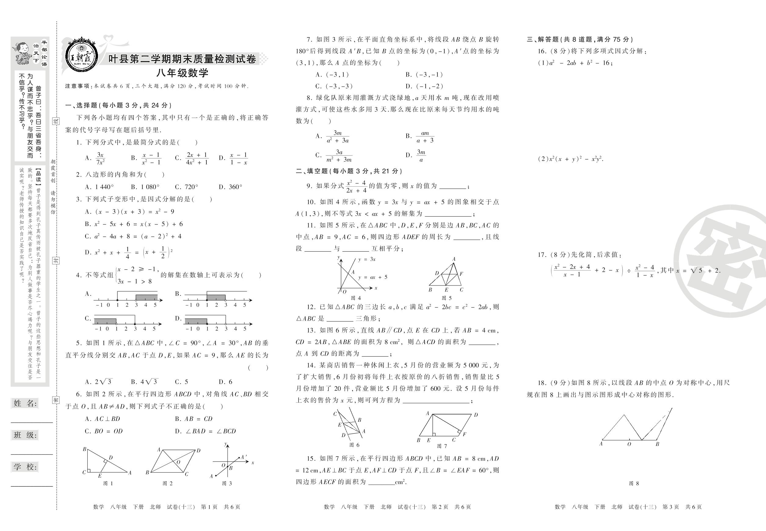 2015-2016学年第二学期平顶山市叶县八年级数学试卷(北师版)【13】