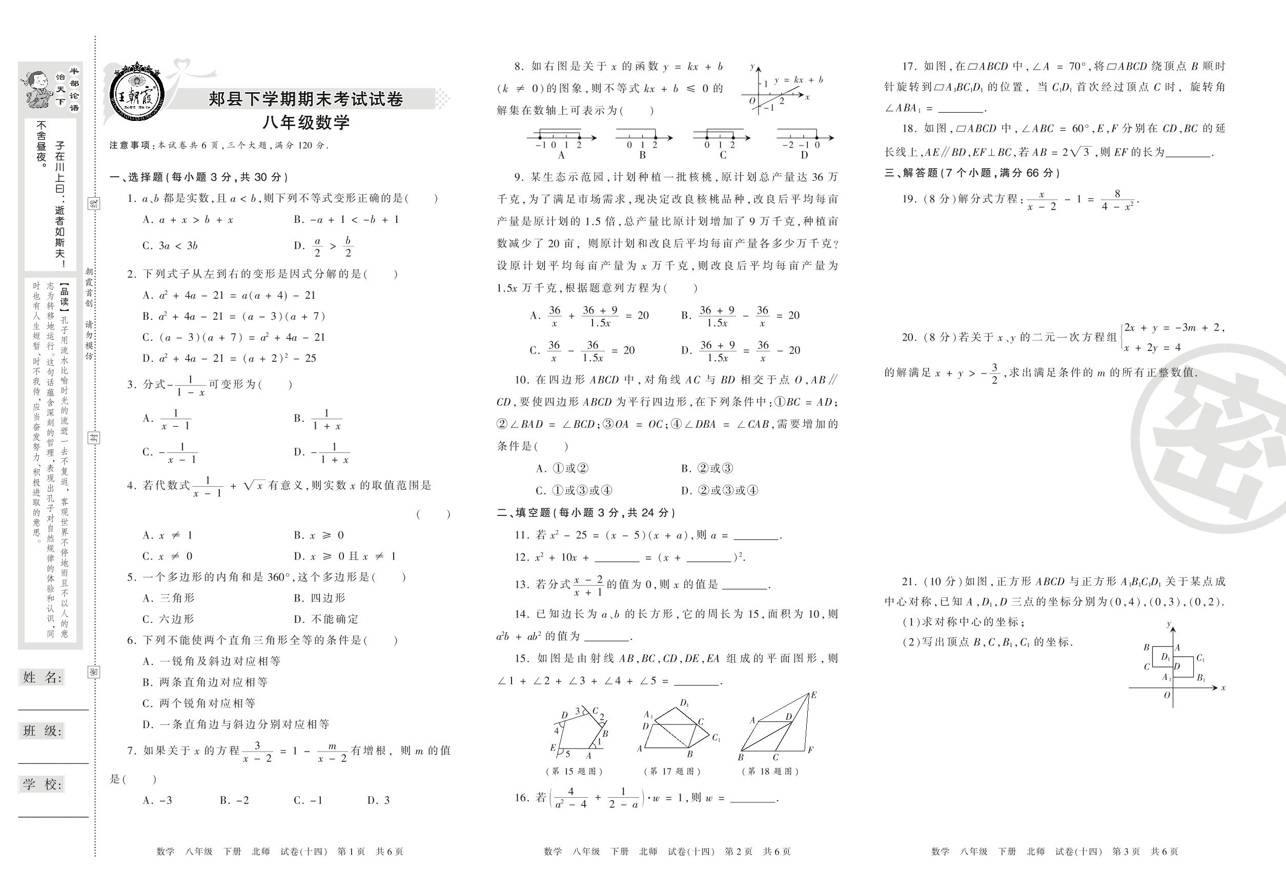 2015-2016学年第二学期平顶山市郏县八年级数学试卷(北师版)【14】