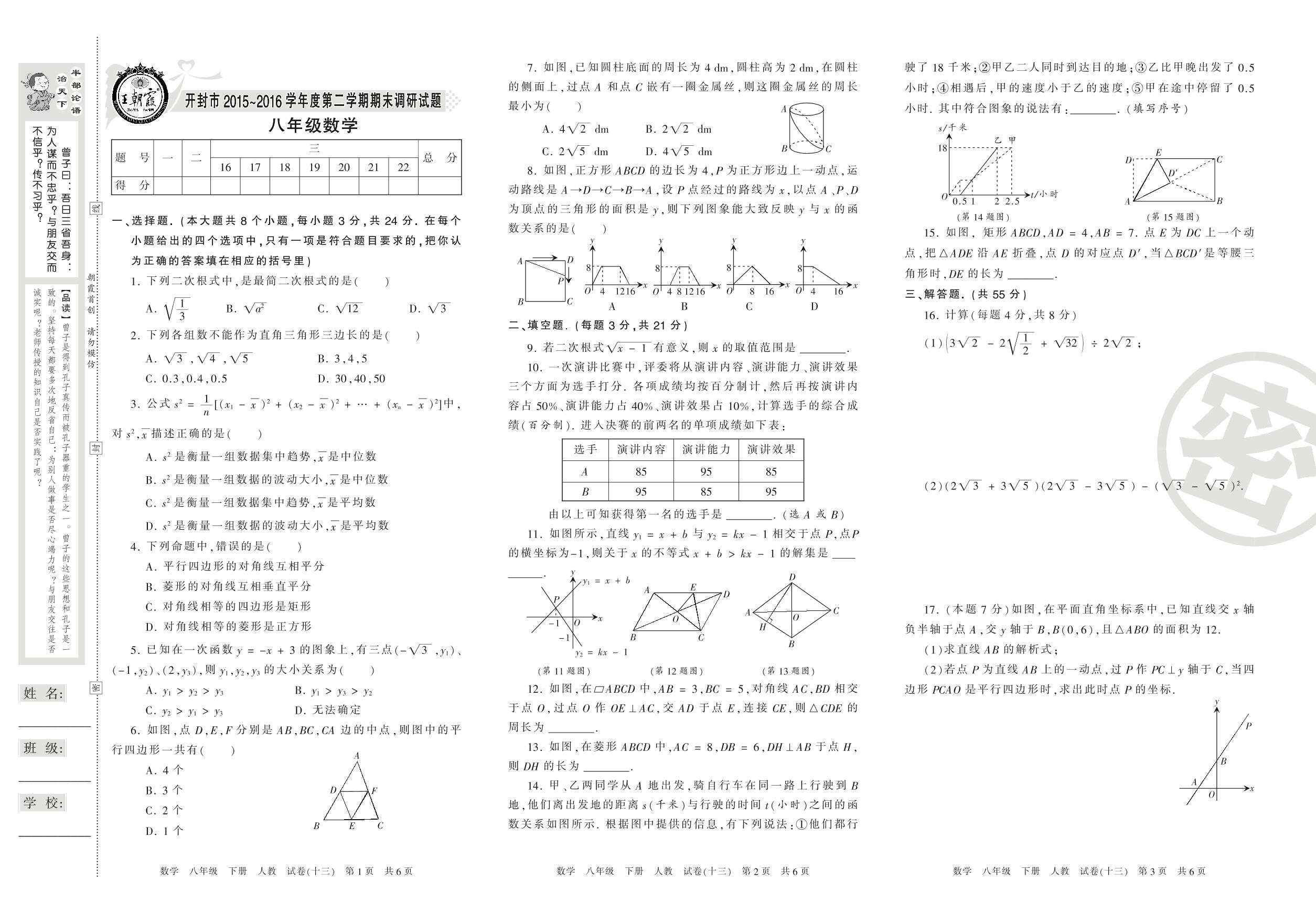 2015-2016学年第二学期开封市八年级数学试卷(人教版)【13】