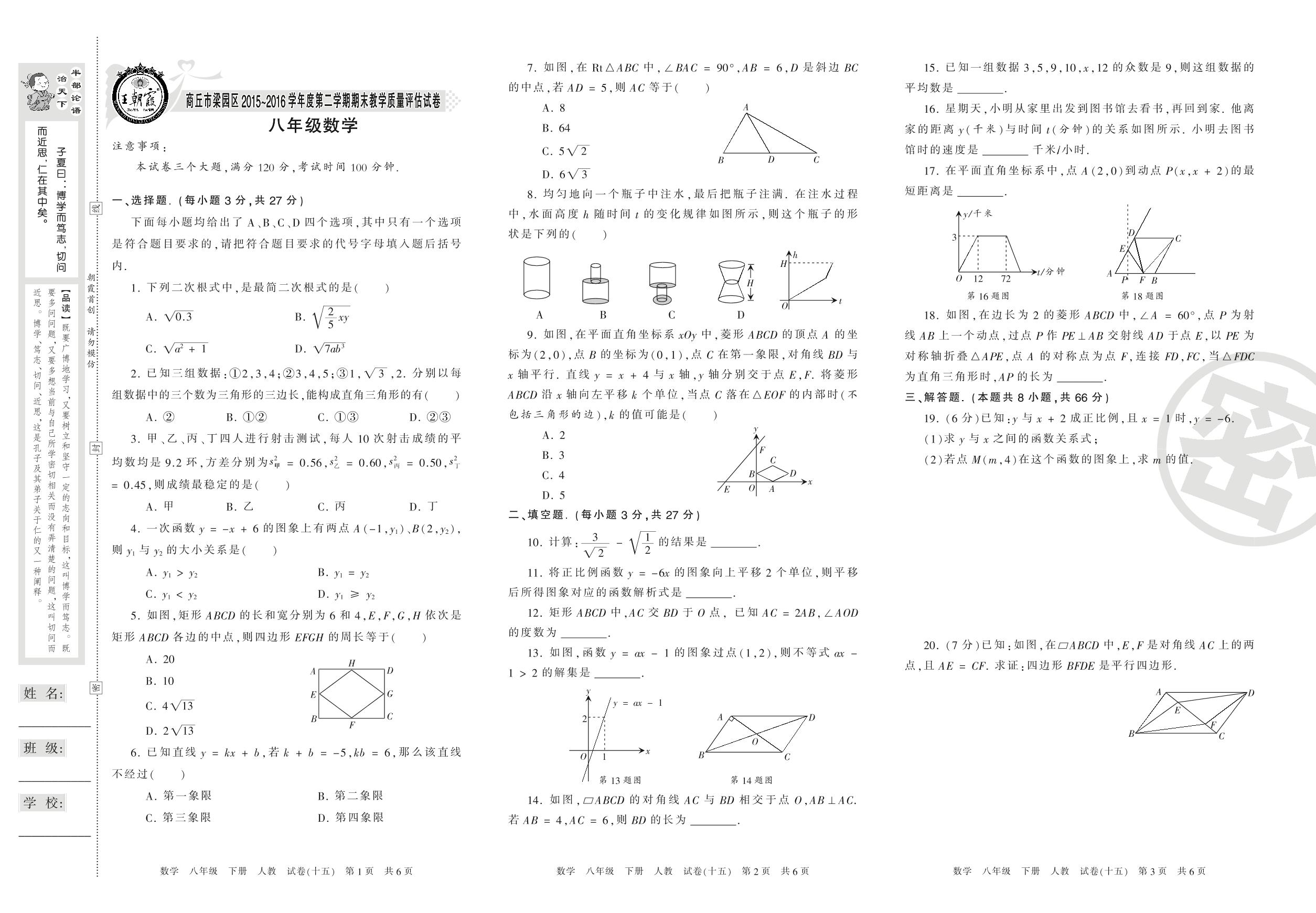 2015-2016学年第二学期商丘市梁园区八年级数学试卷(人教版)【15】