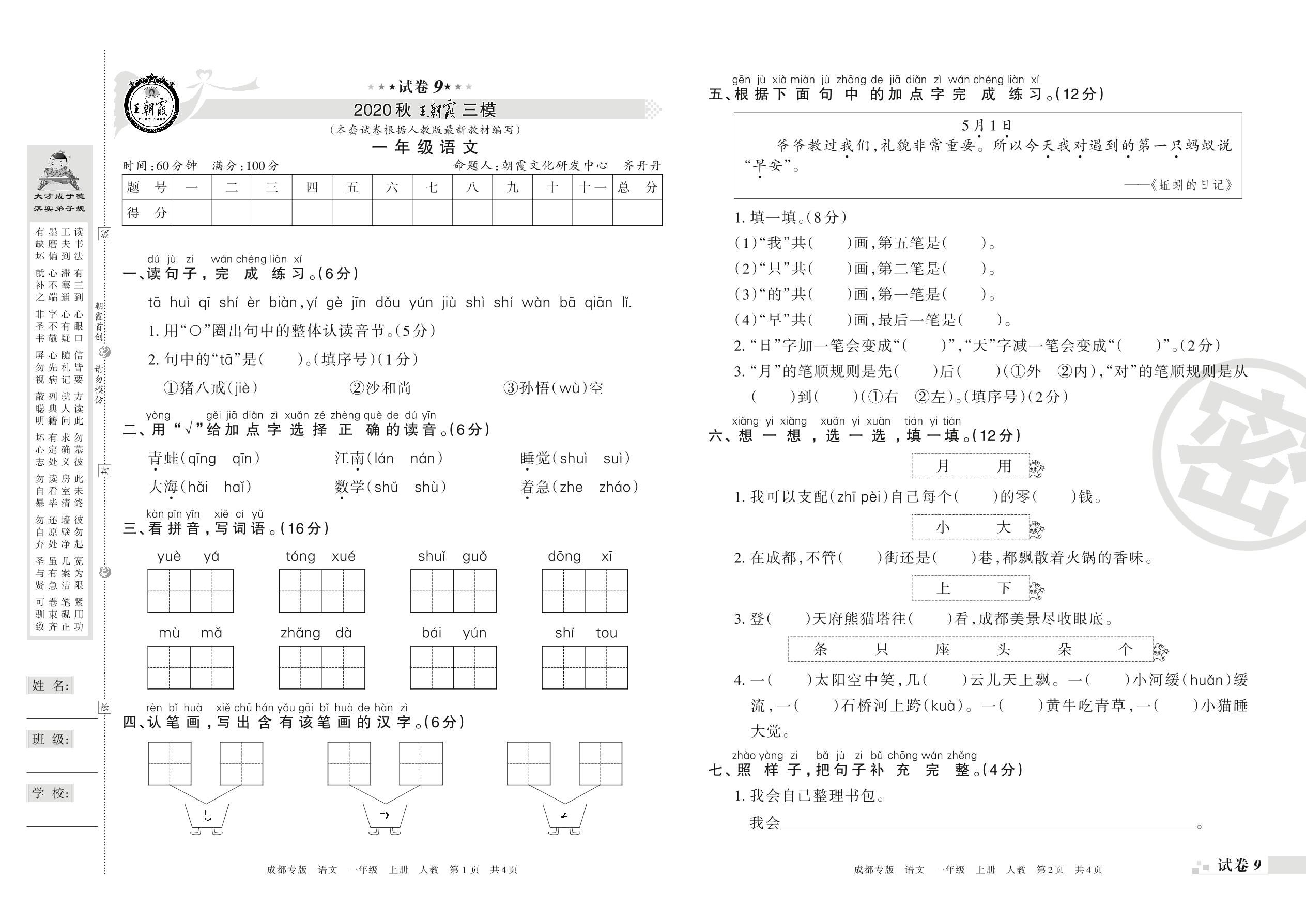 王朝霞期末模拟卷一年级上册语文(人教版)_R210731174609【9】