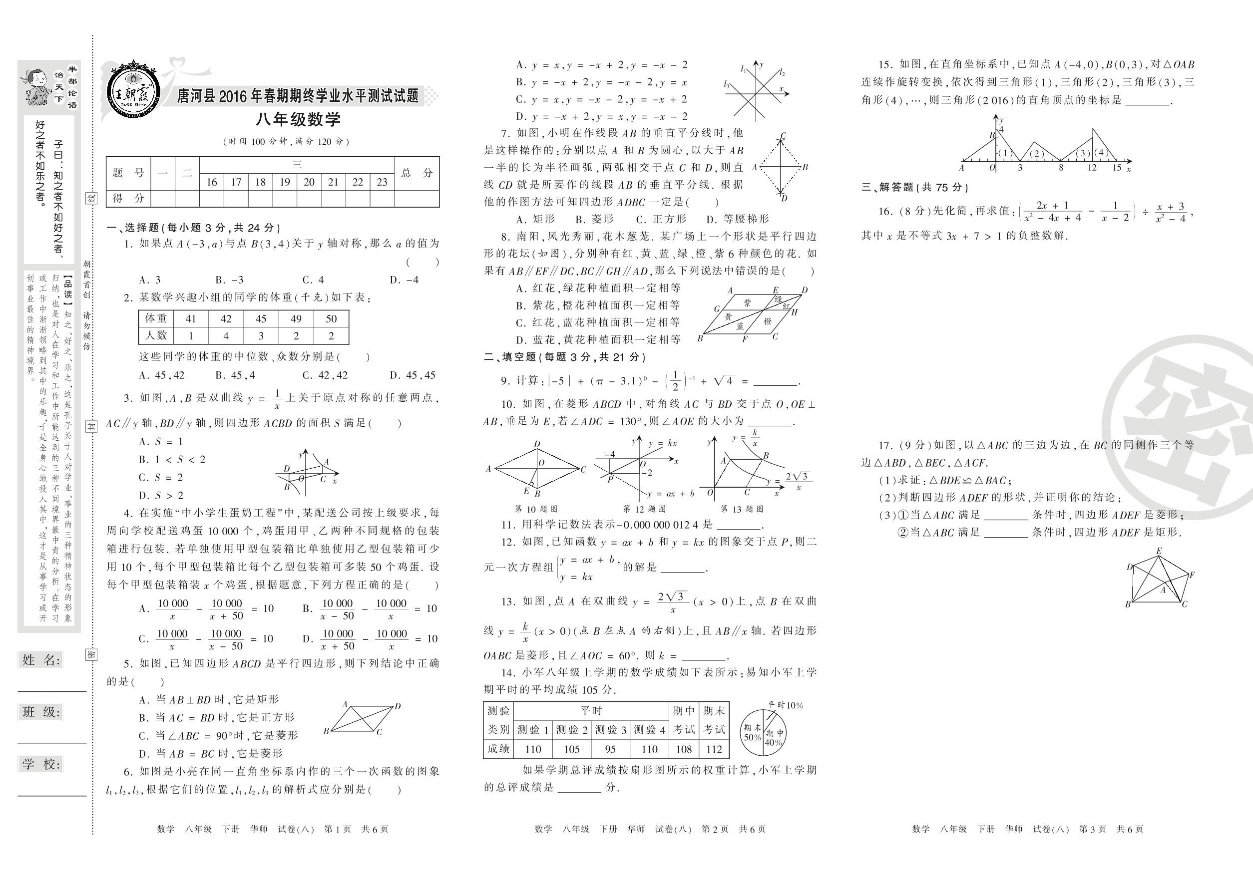 2015-2016学年第二学期南阳市唐河县八年级数学试卷(华师版)【8】