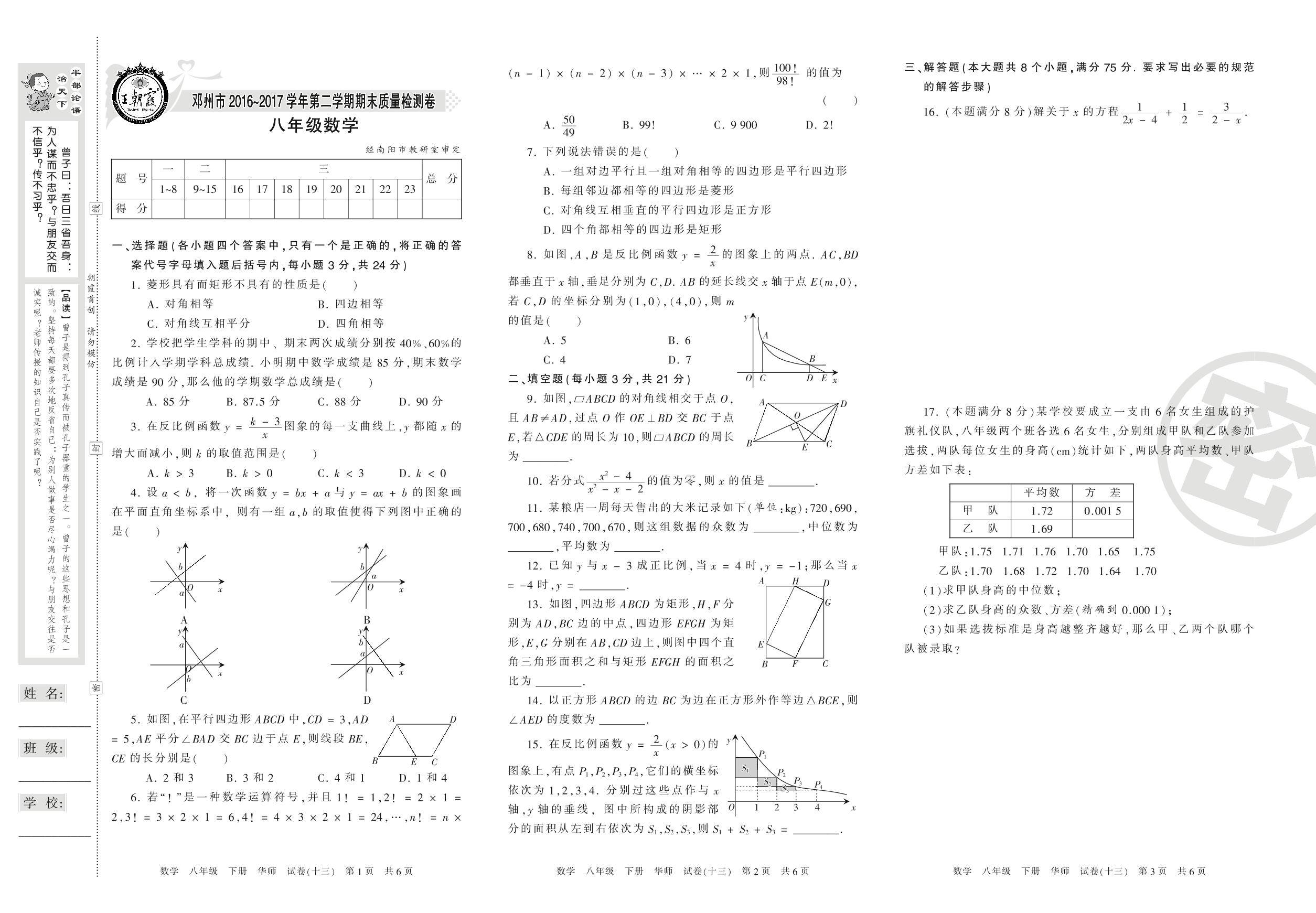2016-2017学年第二学期邓州市八年级数学试卷(华师版)【13】