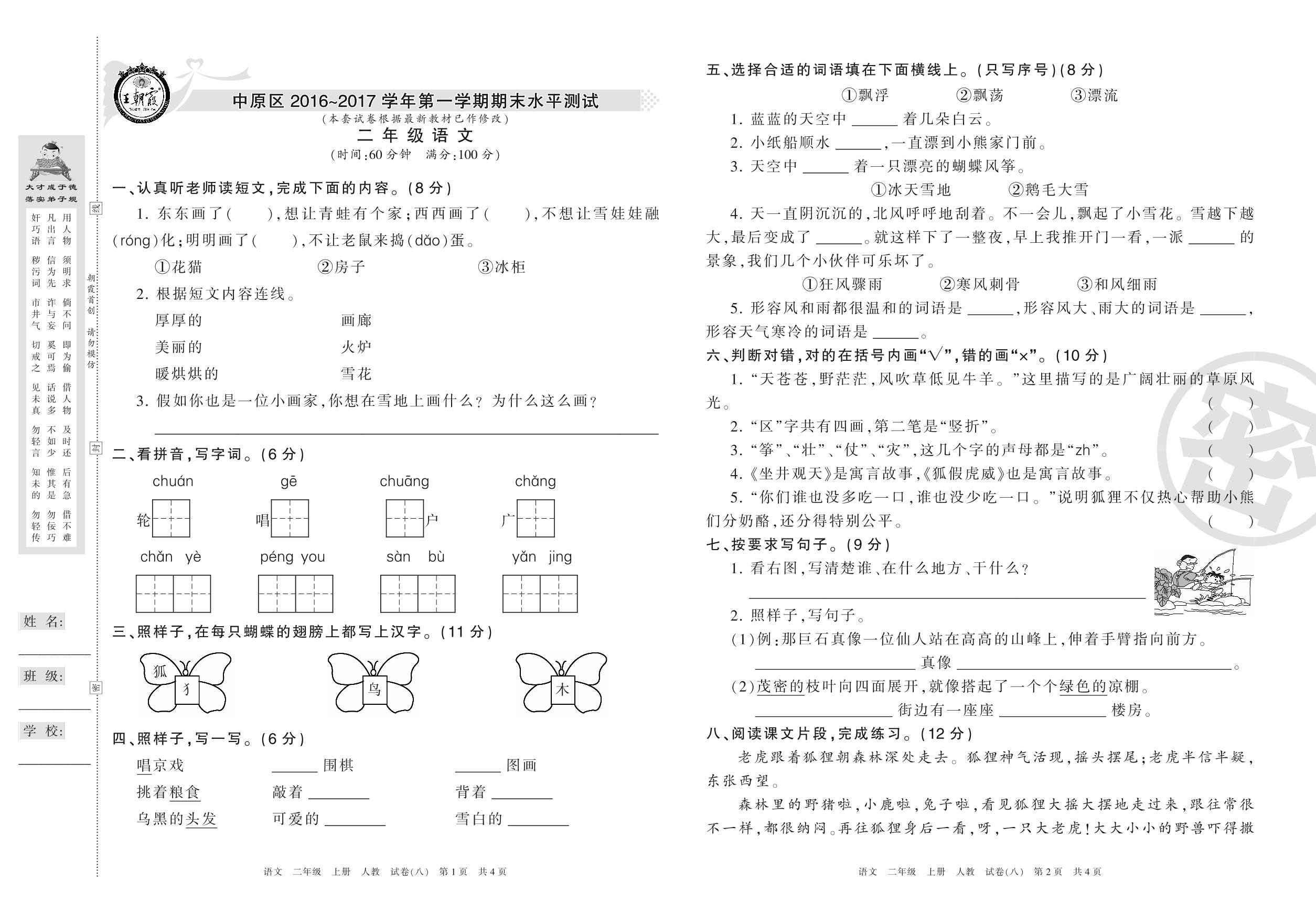 2016-2017学年第一学期郑州市中原区二年级语文试卷(人教版)【8】
