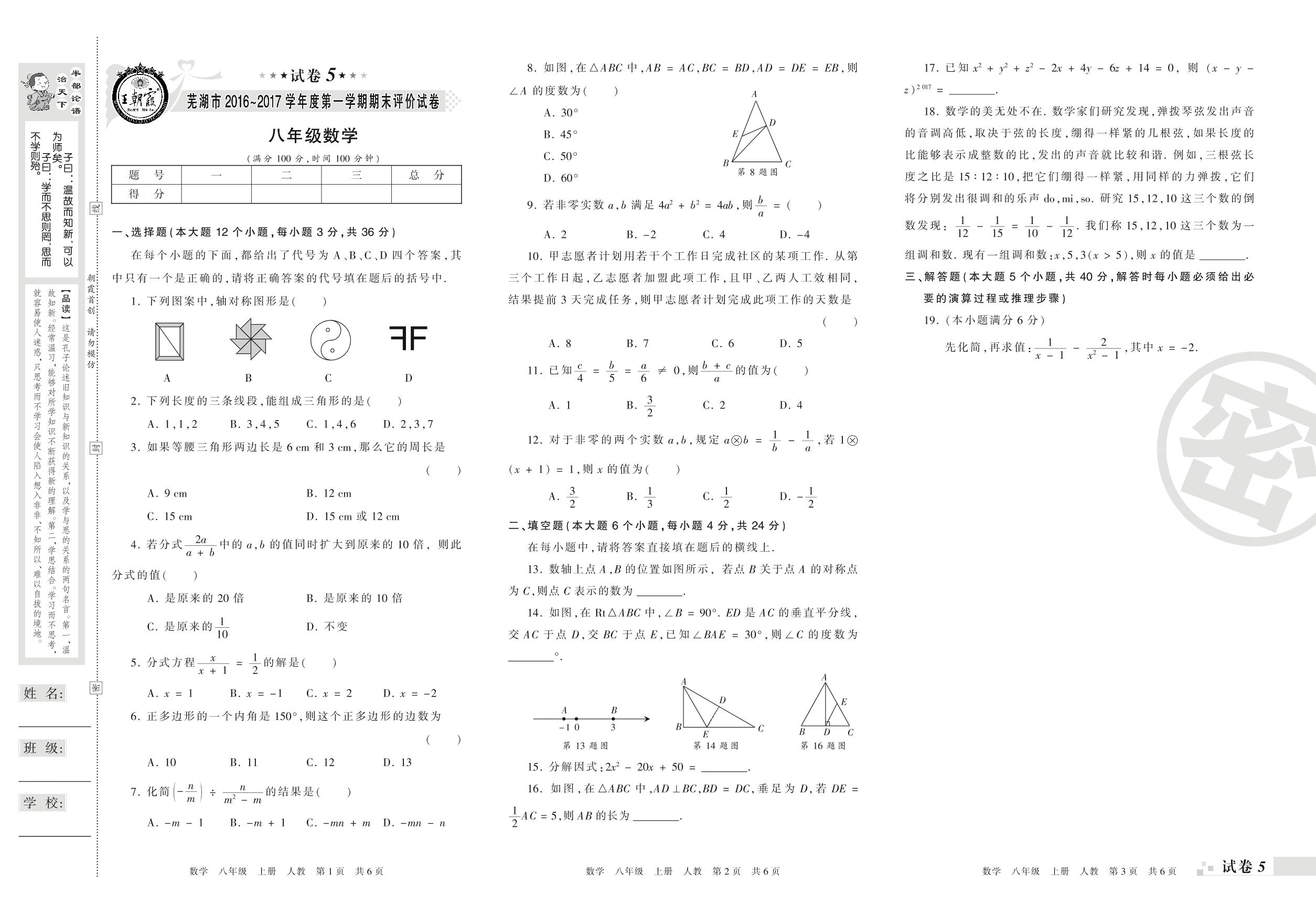 2016-2017学年第一学期芜湖市八年级数学试卷(人教版)【5】