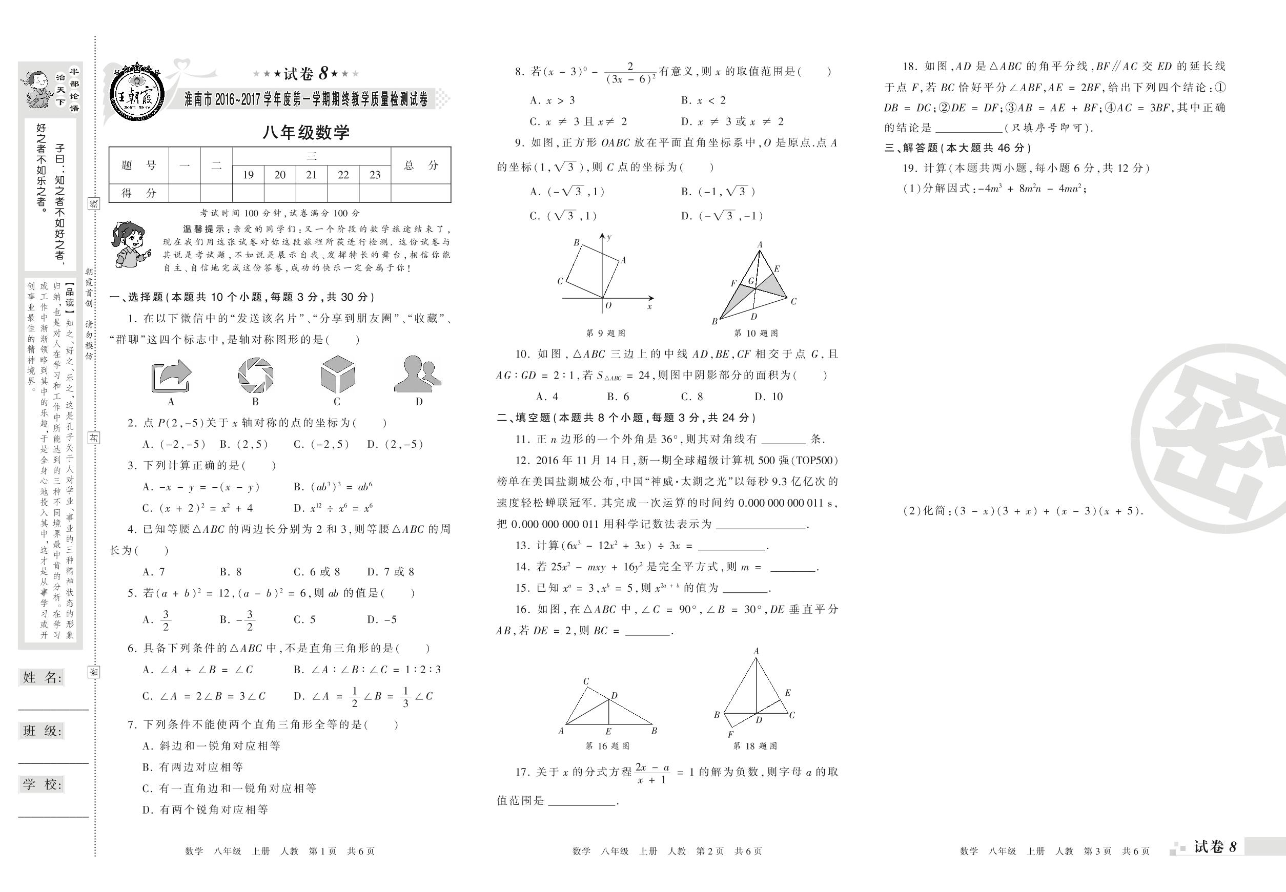 2016-2017学年第一学期淮南市八年级数学试卷(人教版)【8】