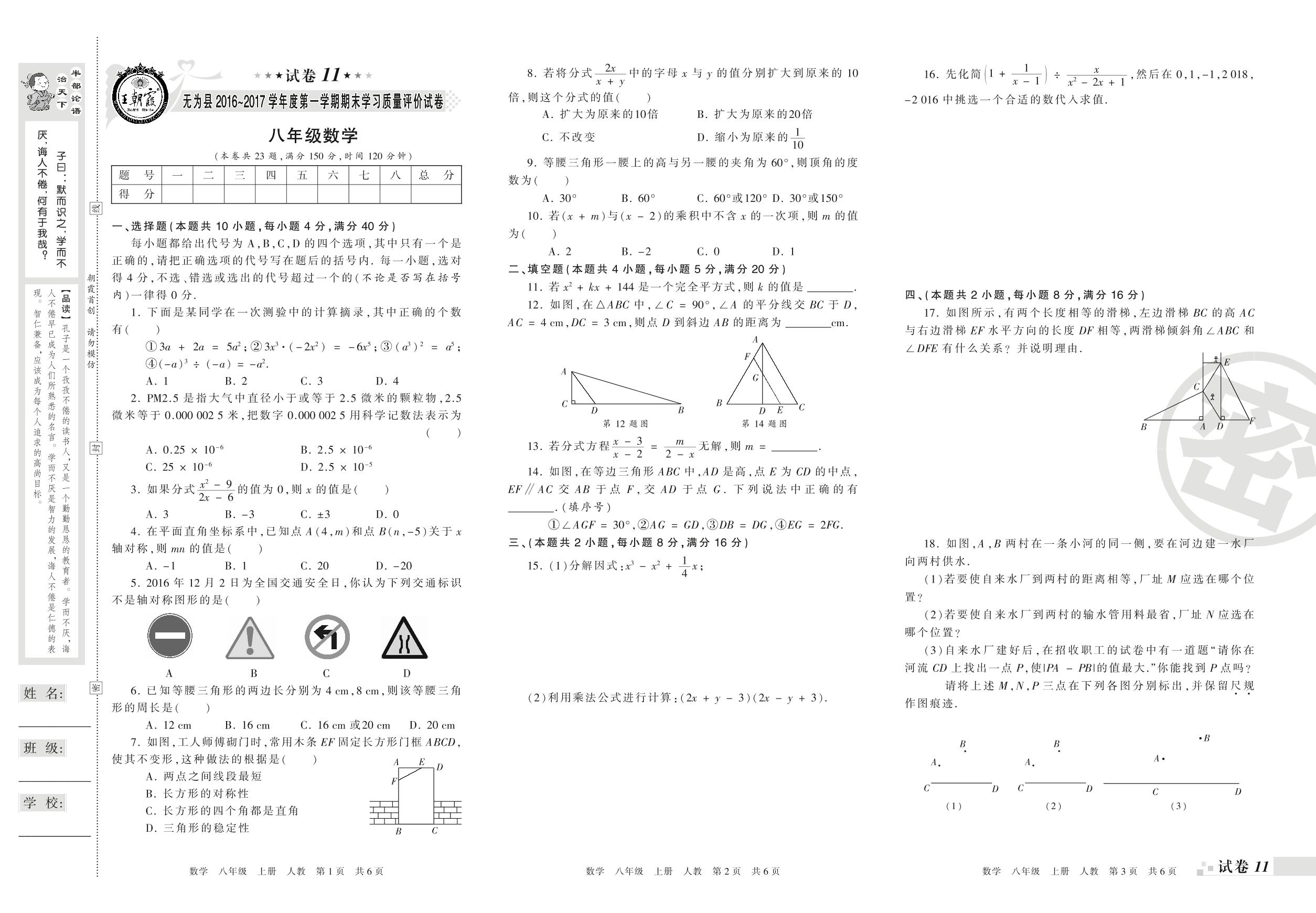 2016-2017学年第一学期芜湖市无为县八年级数学试卷(人教版)【11】